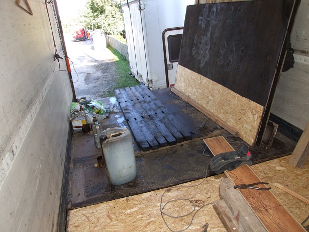 Kuna auto lubatud koormus tuleb enamuses paari ruutmeetri peale, siis tuleb see koht veidi ümber teha. Tugevamaks loomulikult. Võtsin põrandad üles ja panin põrndaplaatide alla prussid. Koorma koha peale kohe eriti tihedalt.
