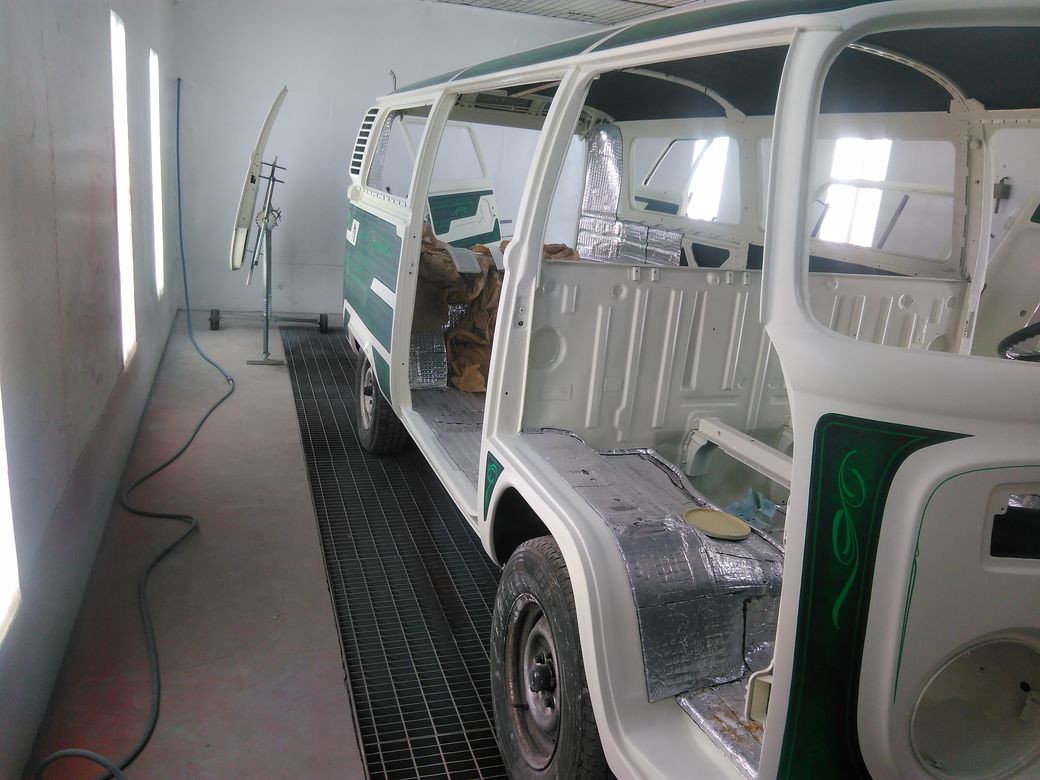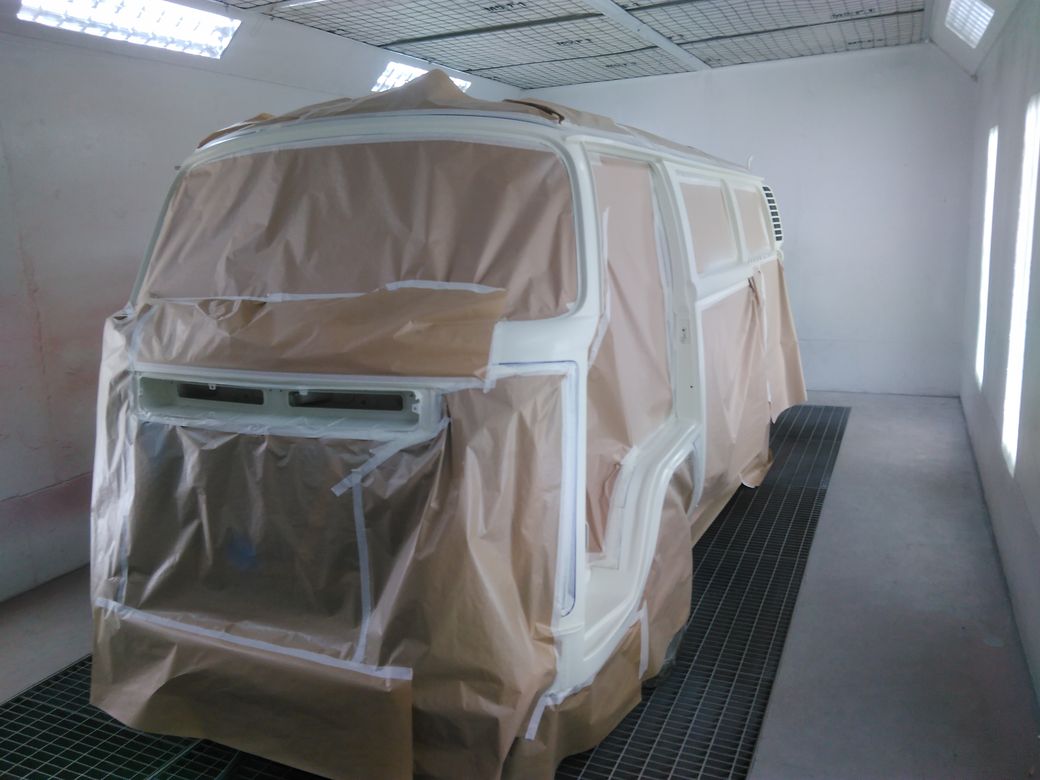 ... seejärel sai vajalik ära lihvitud ning tolmused paberid maha võetud ning buss kambrisse lükatud. Seal siis uuesti katmine. Seekord siis värvi jaoks. Peale värvimist sai katuselt eemaldatud katted ja teibitud lakkimiseks kinni bussi ülejäänud kere. Me nii karvase rinnaga ei ole,et kohe oleks julgenud kogu bussi laki alla tuisata. Ehk teeme kahes osas. Katus ja siis kere. Homme lähevad kerele ka esimesed kerged lakikihid peale ja loodetavasti ustele/luukidele samuti. Siis on esimene ring tehtud ja läheb oma aega ootama.