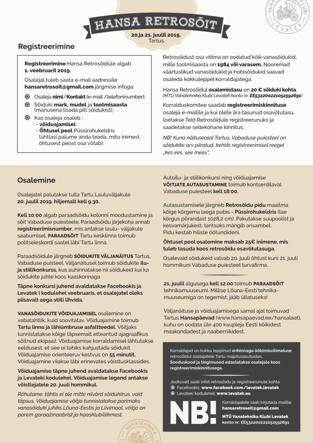 Ootame teid sellel suvel Tartusse vanatehnikaüritusele. Klubi Levatek korraldab koostöös Tartu linnaga hansapäevade raames toreda koosviibimise. Kogu info on lisatud manuses.