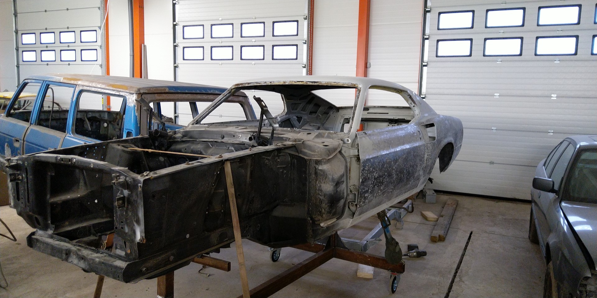 Ettevalmistus keretöödeks! Autot on ikka iga külje pealt natuke mõlgitud. Tagumise poritiibade alumised otsad on vahetatud (koledasti) ja kuna plekki on seest poolt vasaraga silutud pärast mõlkimist, siis sai otsustatud, et vahetab mõlemad poritiivad taga välja. Tuleb odavam! Esimene risti tala tuleb ka välja vahetada, sellega on ka midagi kusagil sügatud.