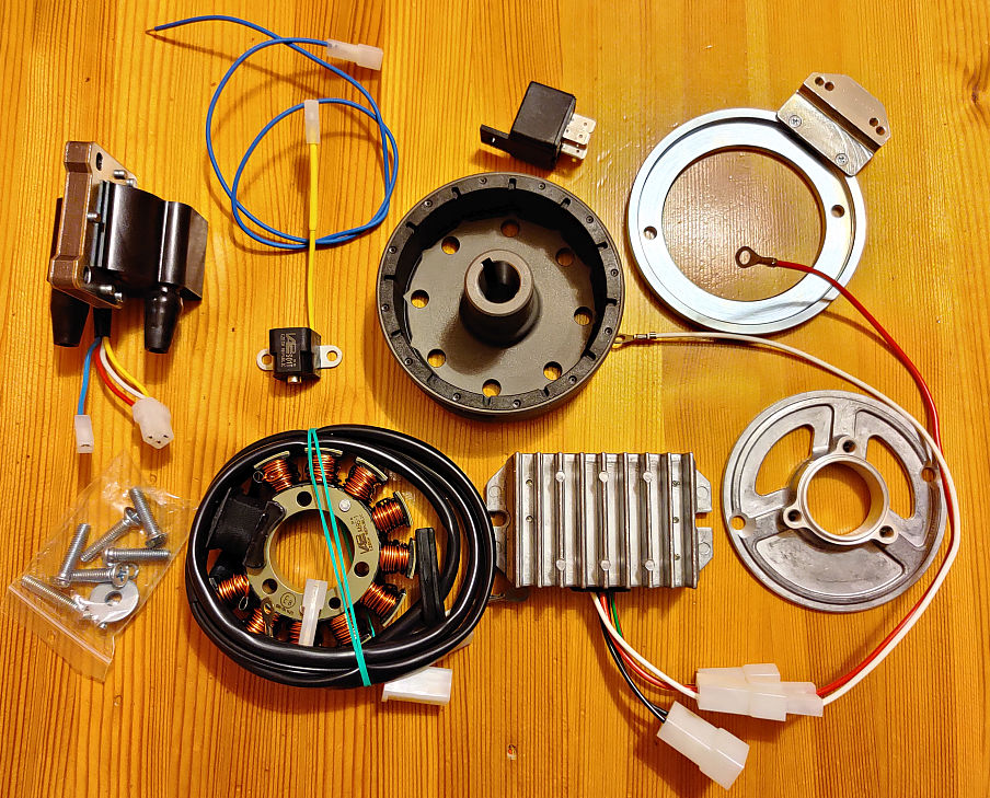 Jätkates magneetosüüte teemadel sai vahepeal mitu asja selgemaks. Nimelt müüakse enamjaolt ikka Hiina rollerite GY6 ühesilindrilistele 125-150cm3 mootoritele kuuluvaid 12V magneetosid, millel on staatori mähiste arv kas 6 või 11 ja sellest tulenevalt erinev väljundvõimsus. Peamine raskus seisneb nende erinevatele mootoritele kinnitamises ja selleks siis tehakse vahetükk rootorile ning ka kinnitusplaat staatorile. Oluline asjaolu, mis mulle isiklikult ei meeldi nende Hiina edasimüüdavate lahenduste juures on see, et rootori vahetükk on ilma kiilusoonteta, kuigi mõlemal koonuspinnal, nii mootori väntvõlli otsal kui rootoril, on kiilusoon olemas. Ilmselt on see universaalsuse eesmärgil tehtud ja samas ka vastutuse vähendamiseks, sest kiilusoon määrab ju üsna jäigalt ära süütemomendi ja -anduri asukoha. On ju rootori peal üks kõrgem kühm, mida süütemomendi andur järgib. Seetõttu ma välistasin enda jaoks selle lahenduse, kui potentsiaalse süüte nihkumisvõimalusega - võibolla polegi see teab mis probleem, aga otsustasin seda eos vältida. Tegelikult on veel üks trikk, mida selle magneetoga tehakse, et saaks seda ühesilindrilise magneetot müüa ka kahesilindrilistele. Nagu aimata võib, keevitatakse teisele poole rootorit, olemasoleva süütekühmu vastasküljele veel üks plekitükk, et tuleks ka teise silindri jaoks pauk. Mõlema silindri süütepoolid töötavad siis paralleelis ja annavad kaks matsu ühe pöörde kohta, mis on üsna tavapärane lahendus. Sellise lahenduse saaks ise kokku täiesti mõistliku hinnaga, nii 70 EUR kanti, pluss muidugi vahedetailid kinnitamiseks. Lisaks on juurde vaja ka süüte kommutaatorit, 12V pingeregulaatorit ja süütepoole, mis jäävad kõik selle nimetatud eelarve sisse. Ühesilindrilise lahendus tuleb veidi odavam. Ongi plaan ka selline töö ette võtta, sest mul üks IŽ-56 mootor läheb ka taastamisse ja ehitan sinna sellise süüte korralikult peale.