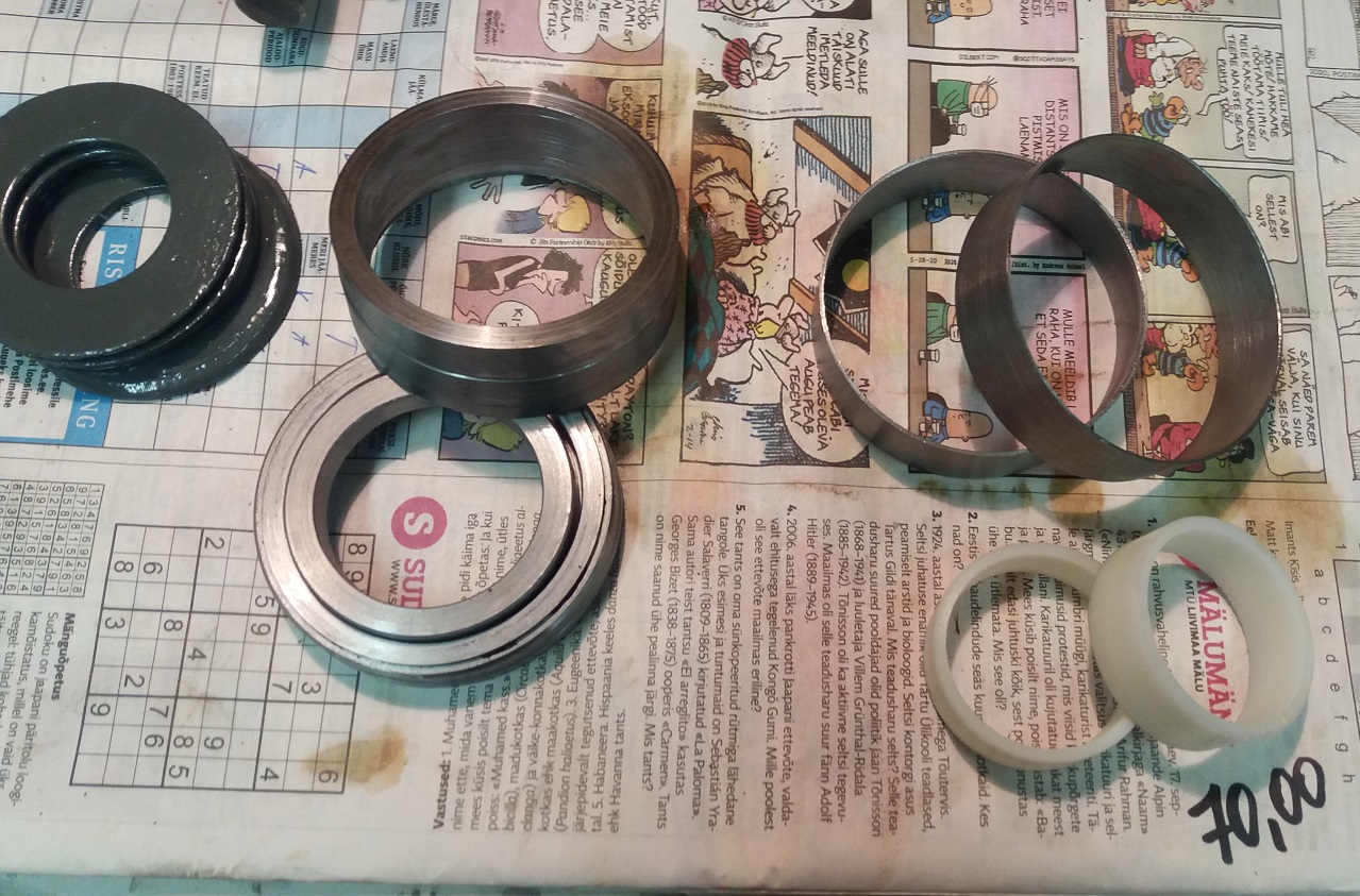 Ära toimunud tegemistest. Paigale sai sätitud ülejooksurataste tihendus. Tööd oli palju, sest välja tulid treida võrdlemisi täpselt 72/70mm ja 45/40 puksid. Pöiale ja võllile vastu olevad pinnad jätsin mõned sajandikud pingu, tihendile vastu olevad pinnad jätsin enamvähem nulliga, sest tihend pingutab ise. Suuremate pukside jaoks hankisin venkude käest kena paksuseinalise 355 torujupi, ei pidanud õnneks täismaterjalist tegema. Sisepuksidega vedas samuti, mul oli täiesti juhuslikult kodus 60mm ümar kapronijupp 30mm avaga. See visati mulle kunagi Sossi mäel asunud plastikufirmast põhimõttel "küll sa midagi leiutad" kauba peale. Vedeles leiutamist oodates umbes kümmekond aastat riiulis.