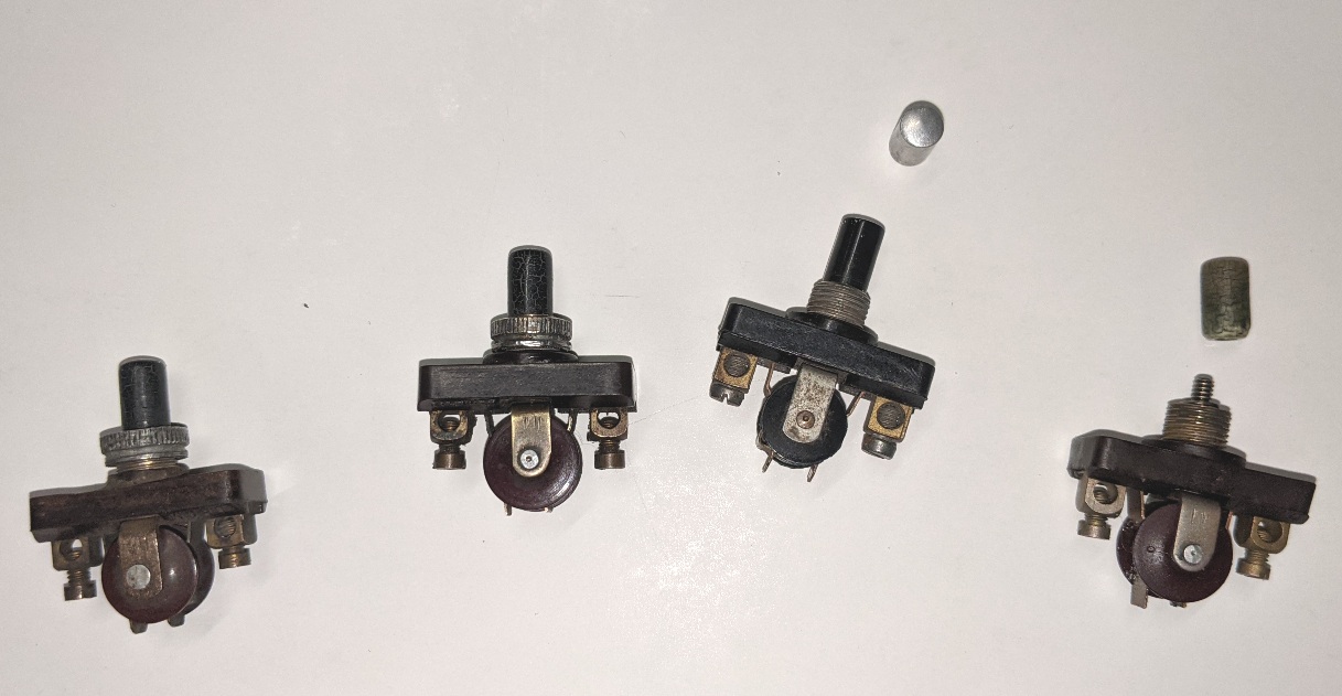 Nüüd on kõik neli varase põlvkonna lülitit olemas. Ühele oli paigaldatud alumiiniumist nupp, mis sai asendatud. Heleda nupuga lüliti vajab veel kohendamist, kuna keere on tollmõõdus. Seejärel on vaja teha õiged mutrid kahele lülitile ning võib lülitite saagale joone alla tõmmata. Hilisemast perioodist pärit teistsuguse põhimõttega lülitid jäävad seega järgmisi huvilisi ootama. Aitäh kõigile, kes neid saatsid.