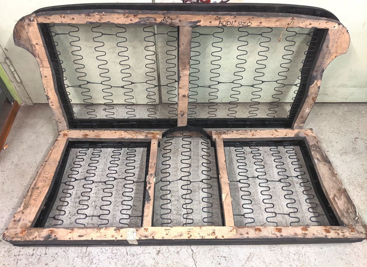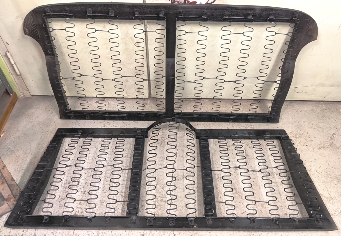 Uued puuraamid, millele on kinnitatud puhastatud ja korrastatud alusvedrud.