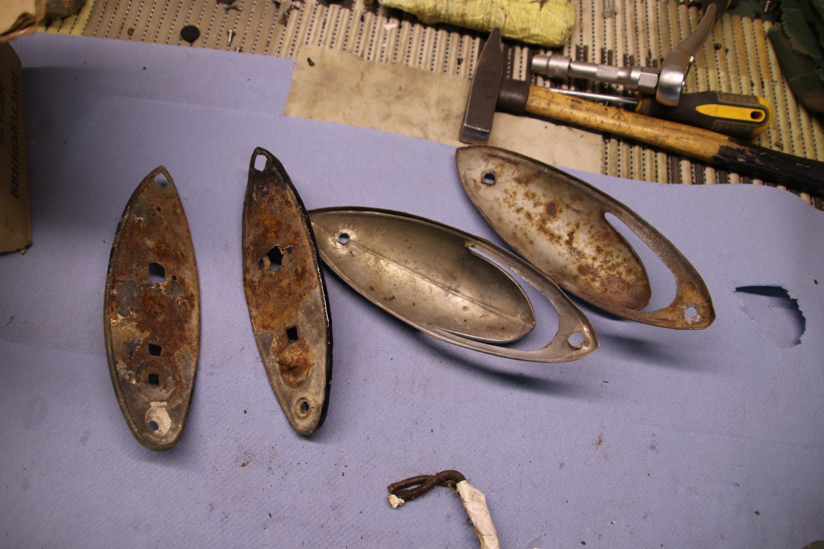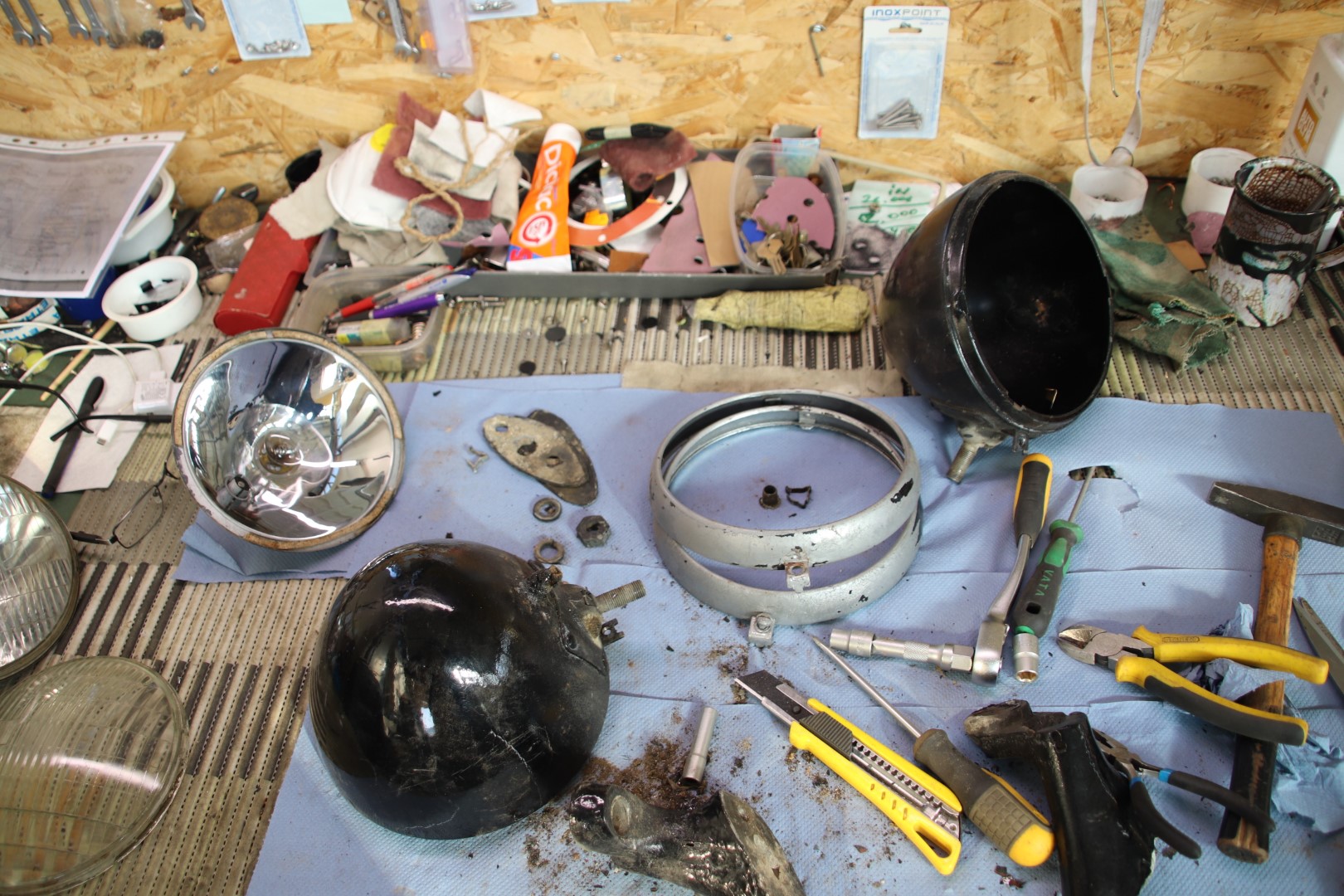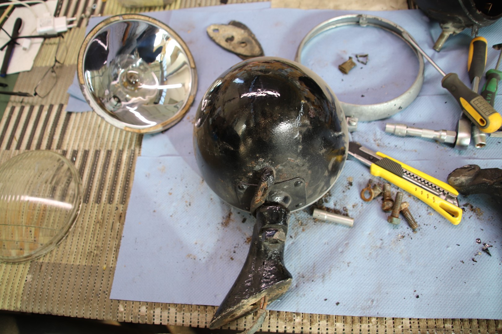 Jätkan sealt, kus eile pooleli jäi. Kuna sellele autole mingeid tagavara juppe saada pole, siis tuleb piirduda olemasolevatega. Eks aegade jooksul on üht teist õnnestunud ka hankida aga kõik see vajab restaureerimist. Ühesõnaga, puhastada, keevitada, tinutada, pahteldada ja värvida või kroomida. Praegu ongi käsil tulede taastamine. Eks pildid räägivad rohkem. Proovin neid kronoloogilises järjestuses panna.