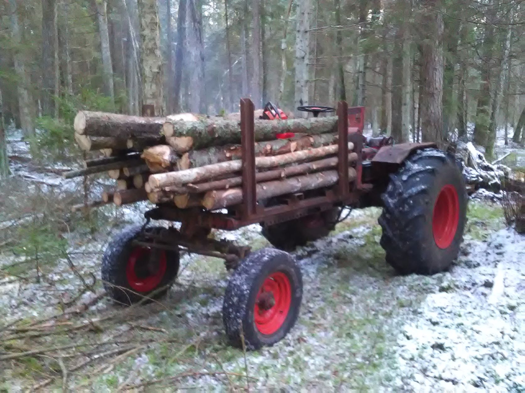 Ohh eks ikka läheb raginal maa sisse- sai seda testitud, aga eks kogemusi hakkab ka tulema ja ei roni igalepoole. Vaatan rajad läbi ja kas edaspidi või tagurpidi, hakkan ennem pealekorjama või siis tagasitulles jne. Vintsi võiks peale nuputada muidu jah mastiga sikutan- tõukan välja. Teisel on käpad ka et saab rattad mülkast välja tõsta ja oksad alla panna. Tagumised sakslase jupid on ka olemas, aga ei ole selle projektiga jõudnud veel tegeleda ja mulle meedib sedasi trikeldada. Ei pea pead kaelaotsas väänama, et midagi sabasse tõsta ja siis on seal kuskil kännu taga kinni. Hea on manööverdada puudevahel, aga jah põidlaid peab kontrollima.