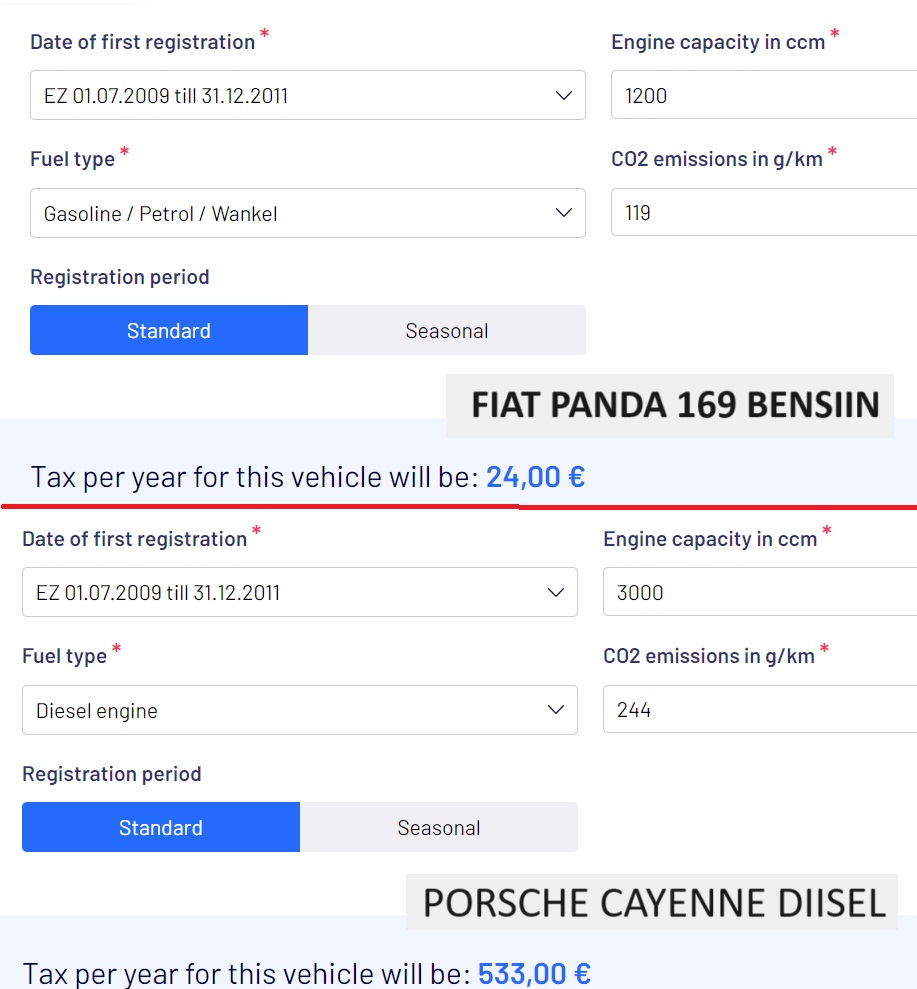 (15-02-2024, 18:04 PM)KertP Kirjutas: Plaanitav varamaks on "rohepöörde" üks osa. Kindlasti siia sobilik.Kui reaalselt rohepöördest ja (õhu/keskkonna)saastamise vähendamise vaatenurgast asja analüüsida, siis oleks meie tulevane automaks mõne teise Euroopa riigiga võrreldes ikka väga mööda. Võtame näiteks "maailmapäästja-säästuauto" Fiat Panda (2009, 1,2 bensiinimootor) ja "maailmatapja-linnamaasturi" Porsche Cayenne (2009, 3,0 diiselmootor). Asukohaks Eesti vs. Saksamaa:
