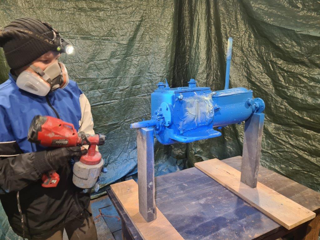 Värvi üritasime saada originaalile võimalikult lähedase. Tegime säilinud tükiga Tikkurilas analüüsi mõõteseadmega ja värvikaartidega ja tulemus oli taevasinise RAL5015. Uurisin ka teadjamate käest aga tundub, et ega keegi vist päriselt ei tea, millised need mootorid tehasest väljudes olid. Küll aga oli arvamus, et ilmselt võisid olla poolläikivad ja soovitati värvida millegagi, mis sinna kinni jääb. Niisiis värviks sai Temadur 20. Värvi kvaliteedis ei pea kahtlema ja lisaks on see algajale värvijale üpris lihtne valik, sest jooksma laskmiseks peab ikka vaeva nägema.