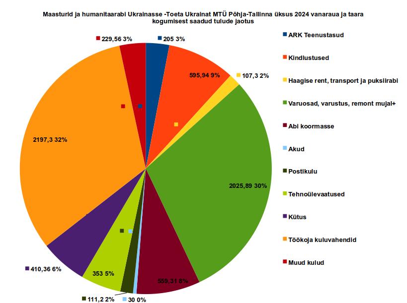 2024a. Kulu nr. 4 , on abi koormasse 9911EUR, mis on neljandal kohal seetõttu, et sellest 6297EUR olid meile tehtud sihtotstarbelised annetused, et meie ostaks selle eest akujaamad, toimetaks need Ukrainasse ja küsiks Eesti riigilt käibemaksu tagasi. Lisaks sisaldab jaanuaris ostetud gaasiballoone (1580EUR) ning märtsi ja maikuus hangitud niiskeid salvrätikuid(201+228EUR) ja sääsetõrjet (304+740EUR). Lisaks oleme toetanud vanaraua kogumisest saadud vahenditega u. 600 EUR väärtuses tööriistadega Ukraina automehaanikuid.