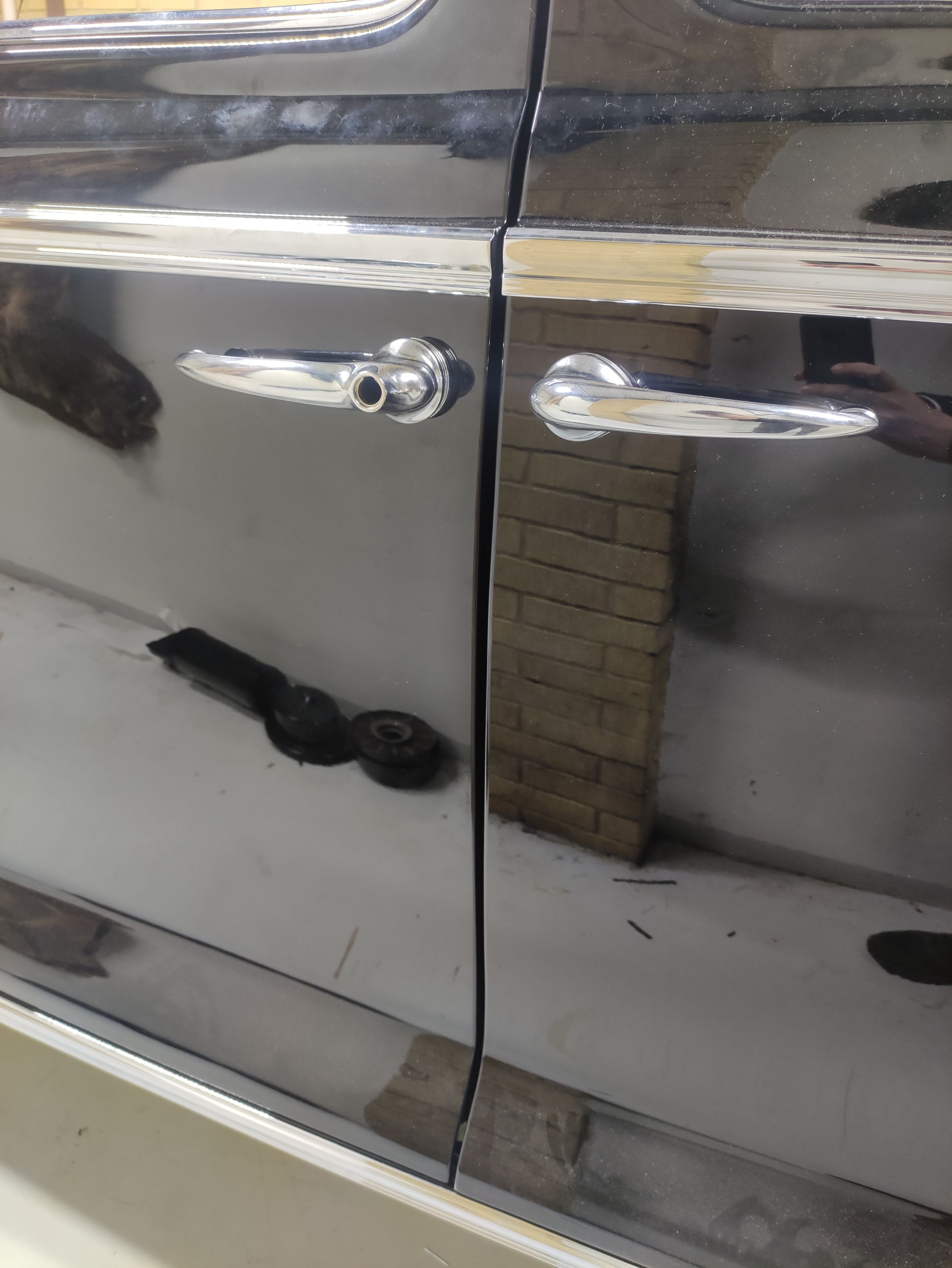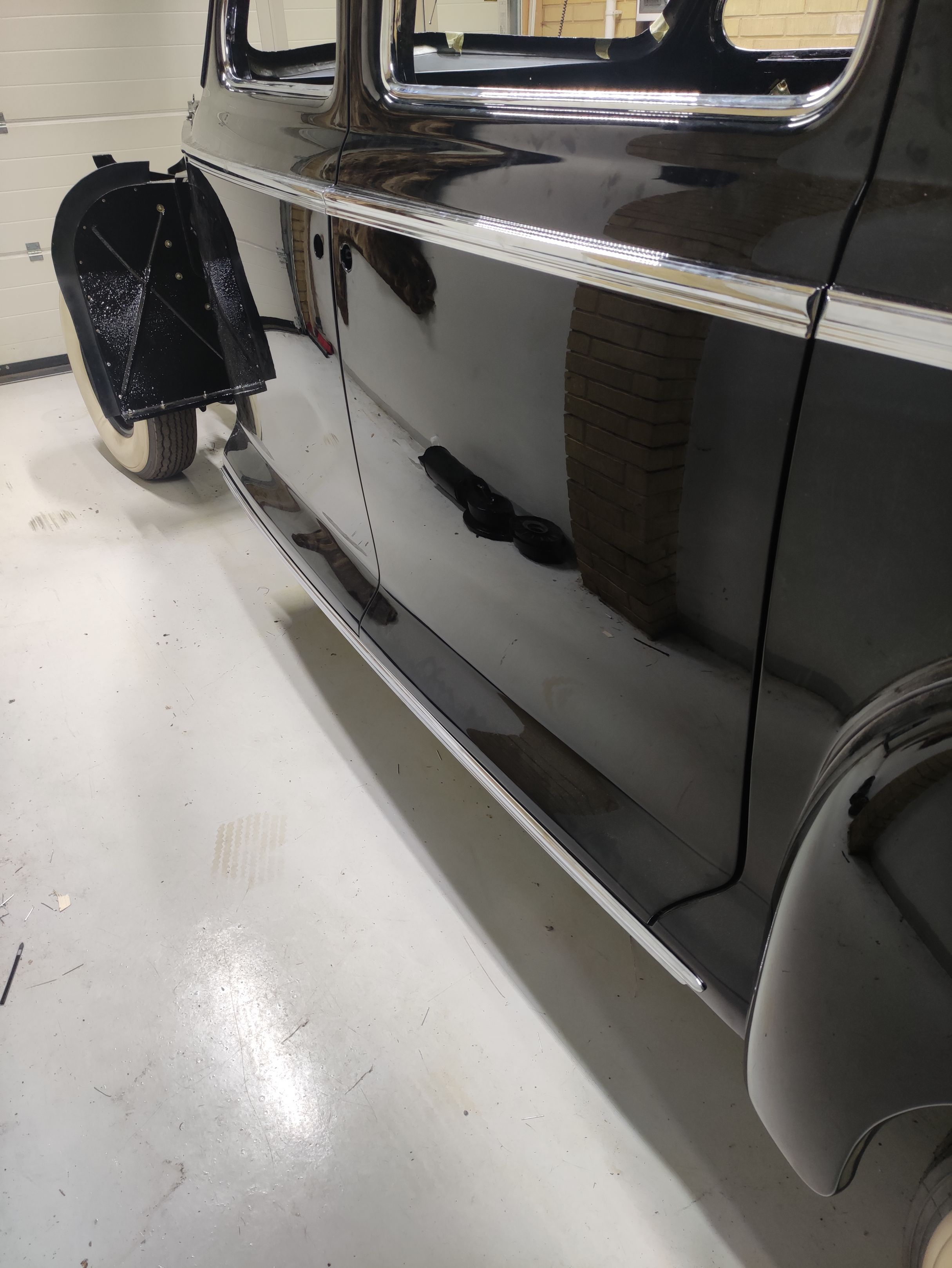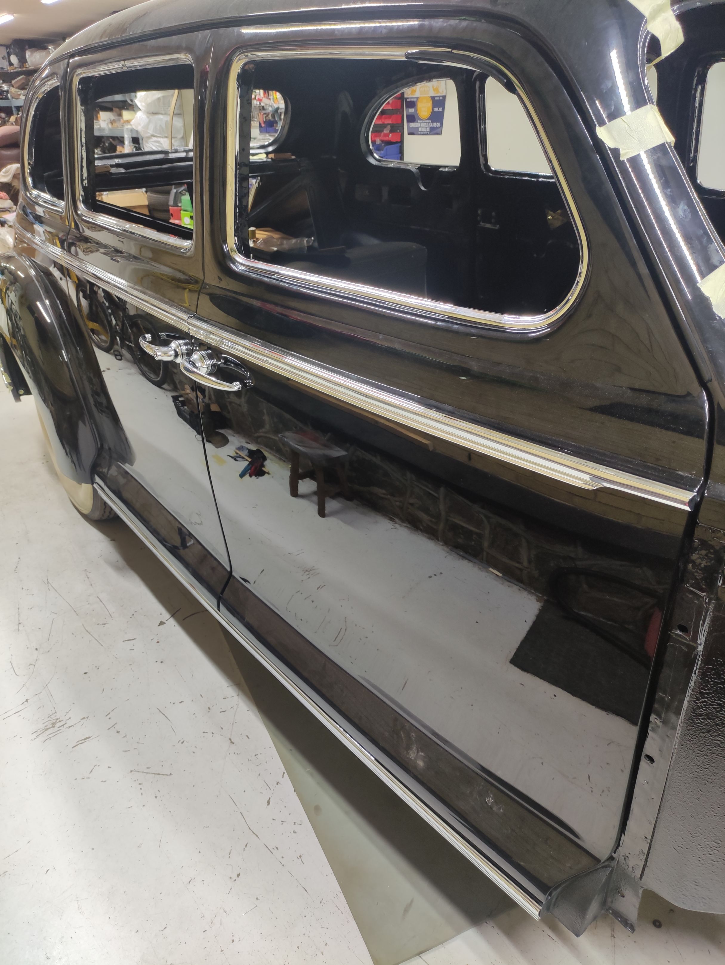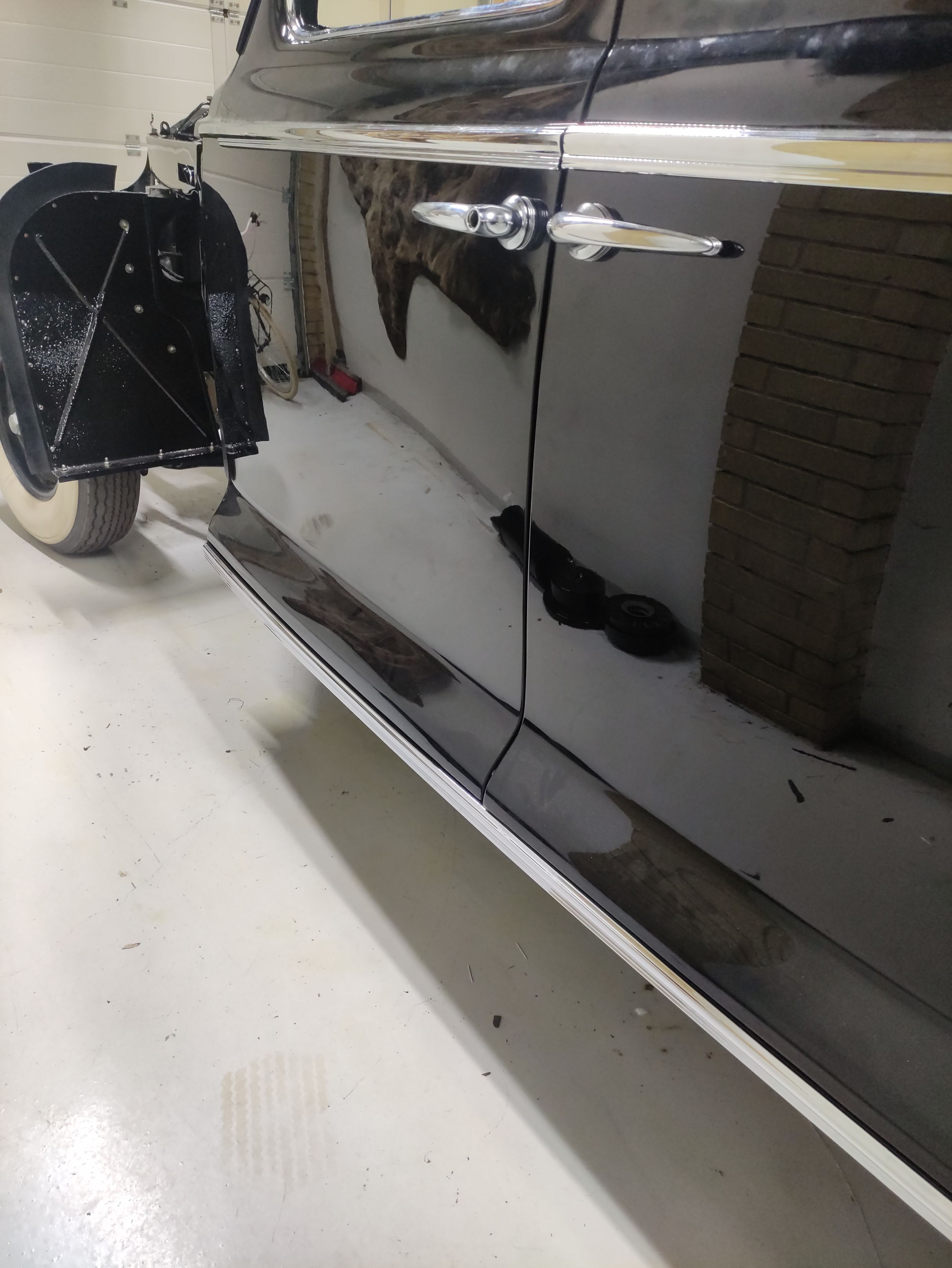 Hakkasime vaikselt kroomdetaile paigaldama. Paika said külgmised aknaraamid, uste ja tagatiibade liistud, küljekarbi liistud ja lingid. Esiakende raamide all, seal kuhu tulevad kolmnurkaknad on ka nn veerennid, mis aitavad vältida vihmavee sattumist salongi akende avamisel. Lingid said ka paika aga need vajavad veel reguleerimist.