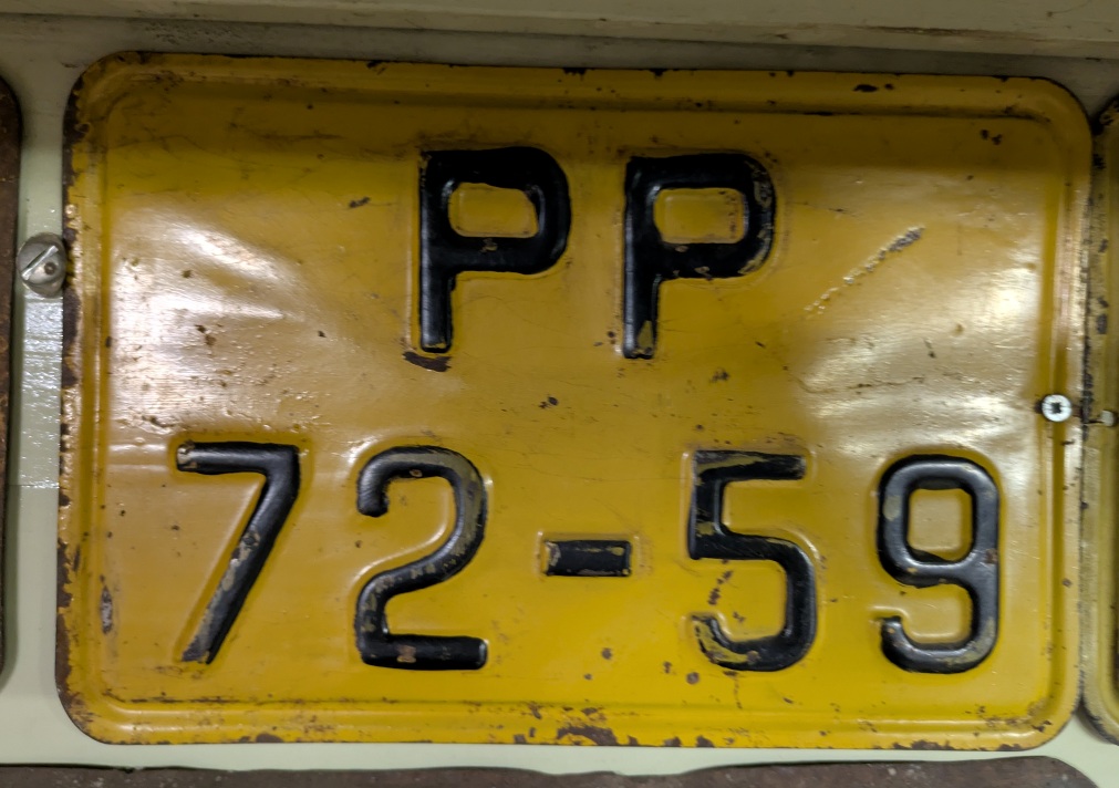 Mind huvitab aga selle registreerimismärgi lugu. Kuidas ta on seotud selle konkreetse sõidukiga? Mis piirkonnas on see number välja antud? Ma ei tea, et Eestis oleks selliseid välja antud ja ka sümbolite asetsus ning kuju on kuidagi võõrad. Kas invakäru on seotud ka selle piirkonnaga, kus neid numbreid välja antud? Ma ei ole päris hästi saanud aru, mis aastal on see sõiduk valmistatud, kuid tundub 60ndate teine pool. Alates 1959. aastast väljastati juba musta taustaga numbreid. Ajastusse sobiva musta taustaga Eesti NSV-s välja antud numbrimärgi leidmine on kindlasti lihtsam. Saan isegi sellele kaasa aidata.