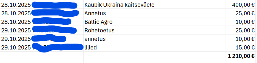 (27-10-2025, 17:52 PM)nastik Kirjutas: Kaubiku ostmiseks on kogunenud 725.- €Kaubiku korjandus edeneb nii, et enamus laekumisi on täiesti sürride kirjeldustega. Tegelikult oleme kursis küll üritusega, mille raames jagati ära ülejäänud vara tasumisega annetusena meie kontole.