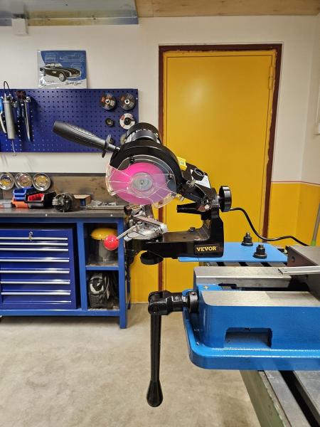 Mõeldud-tehtud. Ja kuna ma juba olen oma käe V-tähega algavale e-kaubamajale andnud, siis sealt sai ka omale vastav riistapuu valitud. Saetootjate spetsiaaltööriistasid käsi ostma ei tõusnud. Aga esmapilgul tundus, et ka hiinlane suudab täitsa korraliku koopia valmis teha. Konstruktsioon on võrdlemisi stabiilne ning valmistatud alumiinium- ja teraskomponentidest. Käepide ja seadekruvide pead loomulikult plastikust. Enda jaoks parima koha paigaldamiseks leidsin olevat freespingi töölaud. Selleks piisas vaid vaheplaadi tegemiseks ning midagi muud lõikuma ei pidanud. Saab kiirelt maha ja peale ning reguleeritava kõrgusega tööasend on peale kauba.