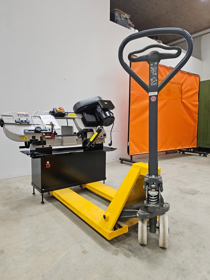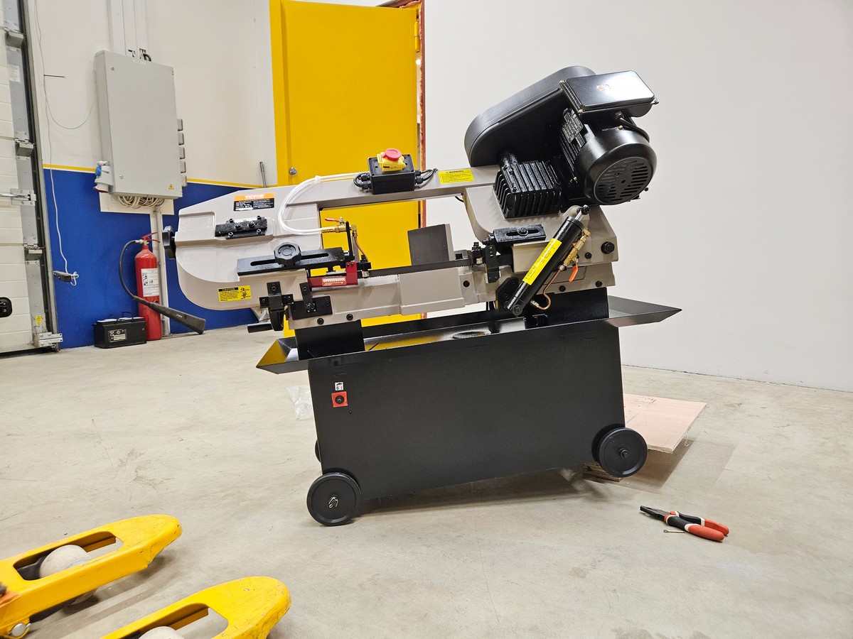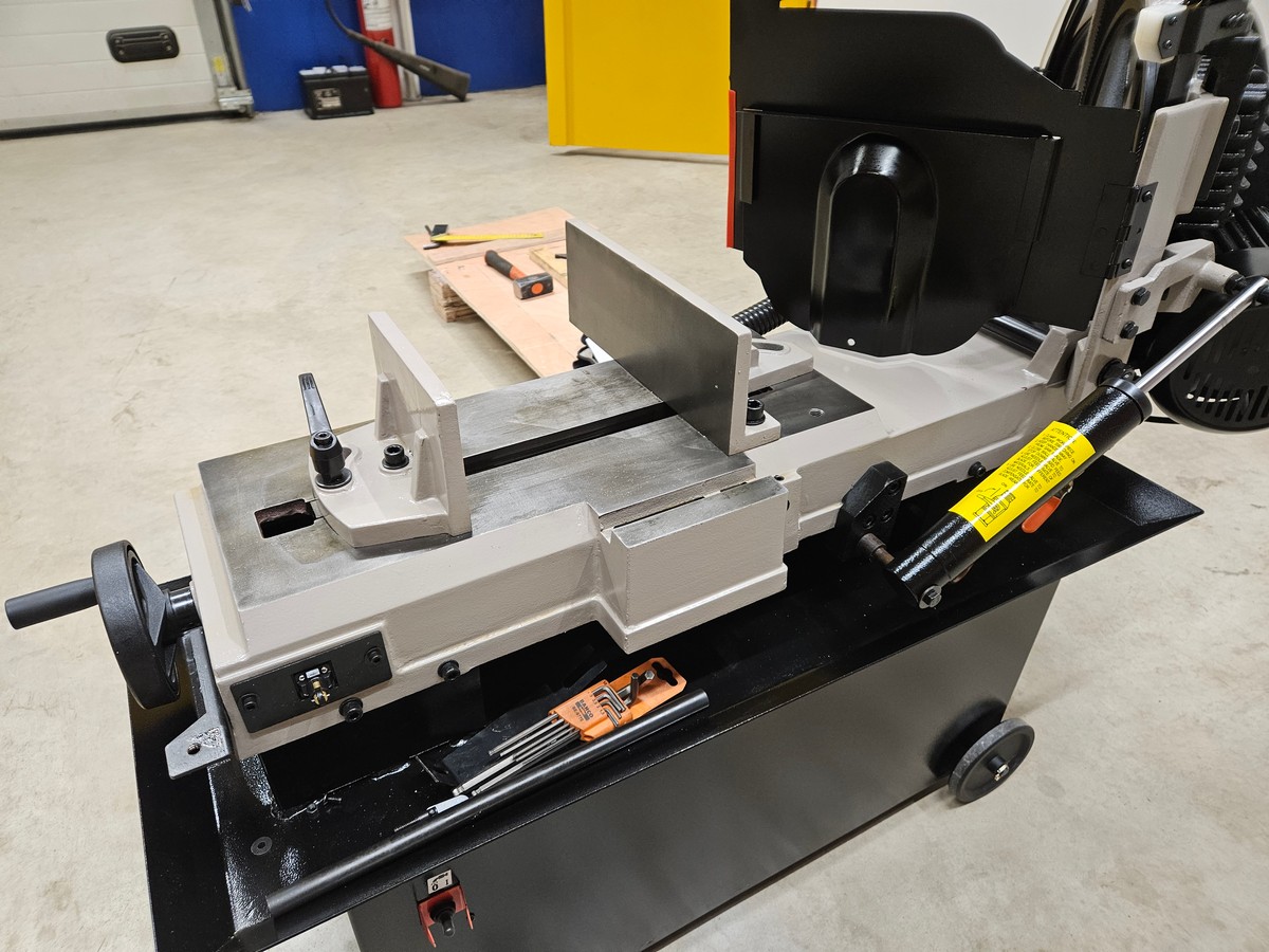 Tuli selline väike riistapuu puust kastis, millest fotol on järel vaid alus. Kenasti pakitud ja tugevate ankrutega kinnitatud. Keda tehnilised andmed huvitavad, siis masina kaaluks 140kg, mootor 1-faasiline 230V 1,1kW, kasutatava lõikelindi pikkus 2362mm, alus terasplekk ning sae alus ja raam malmist. Mootor on fikseeritud pööretega, ülekandearvudega on erinevate materjalide lõikuseks seaditatavad neli kiirust (22m/min, 33m/min, 45m/min, 65m/min). Lõikelaius 45-kraadise nurga all on pea 17cm, 90-kraadise nurga all aga 30cm. Korralikult suur emulsiooni paak koos eraldi lülitatava pumbaga kenasti kaasas ning integreeritud aluse sisse. Toitekaabli pikkus kesised 2m.