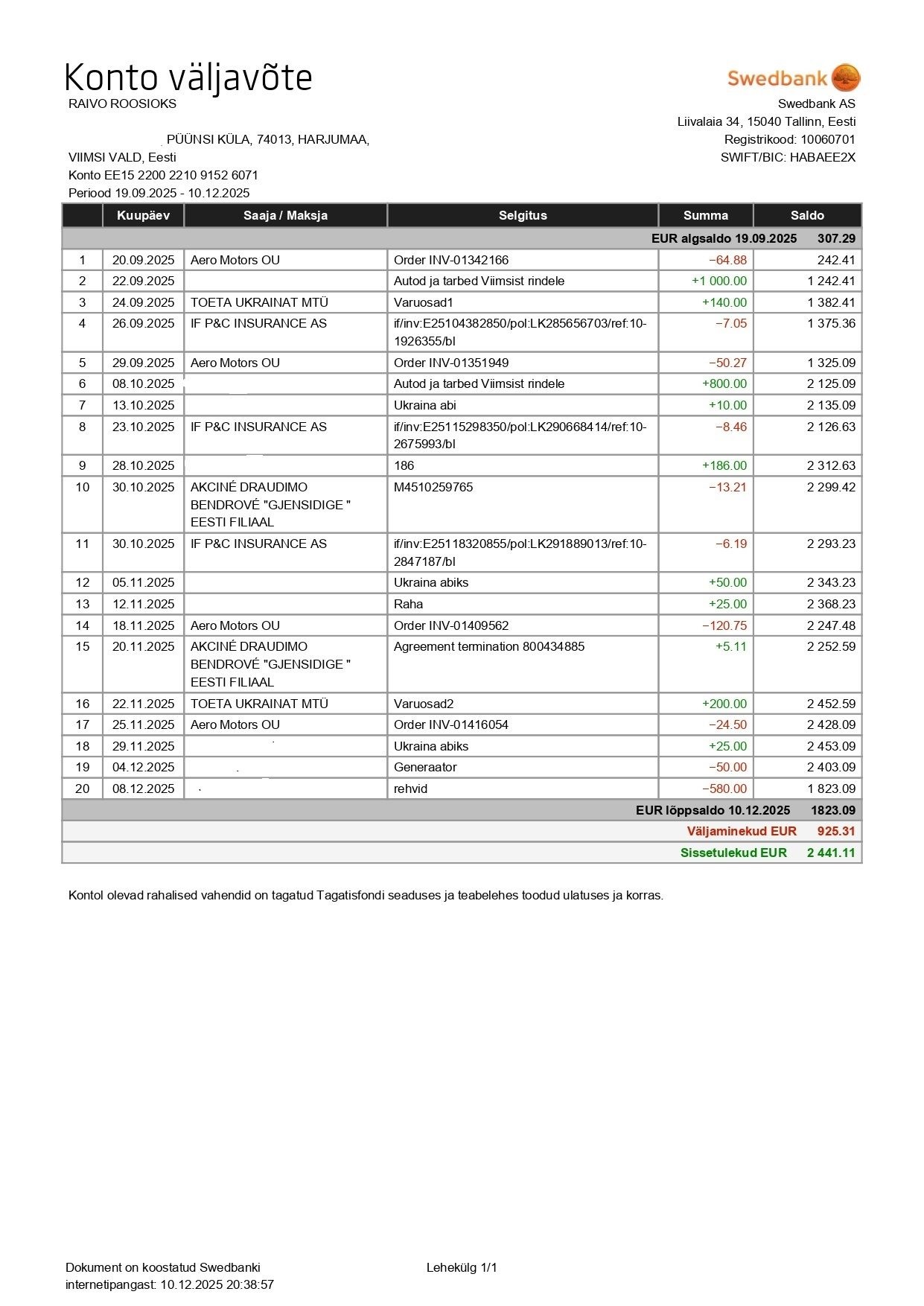 UA abikonto tehnika ning varustuse soetamiseks: Raivo Roosioks EE152200221091526071