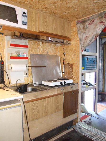 Kööginurgakeses saab vaatamata pooleli olekule ikkagi süüa teha. Aku on laoriiulis ja ajutiste juhtmetega saab ventilaatori käima. Praegu on seda vaja rohkem elamiseks, kui köögiaurude eemaldamiseks. Aknaid ju pole veel ja muidu jääks õhunälga.