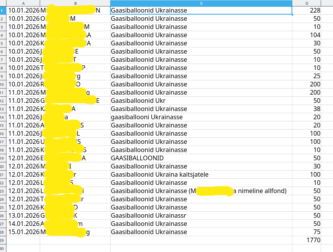 Kokku laekus annetusi gaasiballoonide ostmiseks 1770EUR.