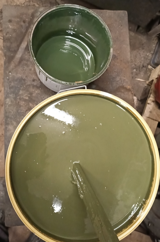 Nagu pildilt näha võib, läheb nato RAL6031 talvel automaatselt heledamaks. Väike ämber on mulle varem toodud värv ja suur täna espakis toonitud. Oli teine veel heledamgi aga valasin sinna liitri vana värvi hulka, et kõik värv sama tooni saada.