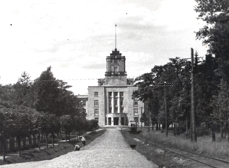 Omaaegne Tallinna Polütehnilise Instituudi peahoone, praegune Tallinna Tehnikaülikooli majandusteaduskonna hoone koos Kopli trammi lõpp-peatusega.