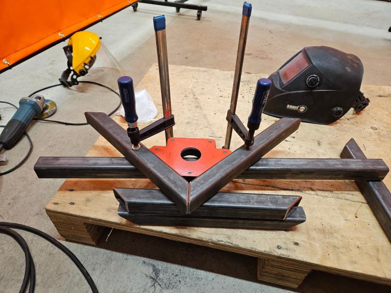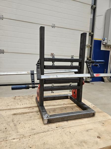 Minu praeguse keevituspinna kõige suurem puudus on lisaks madalale tööasendile ka see, et mul pole võtta ühtegi ideaalilähedaselt sirget pinda. Seega on väga raske kokku keevitada raami, mis ei jääks kõver. Enam-vähem korralikult sirgete raamide kokkukeevitamiseks olen seni kasutanud fotol olevat võtet. Ehk siis kaks kokkukeevitatavat detaili pitskruvidega ühe ja sama jäiga metallitüki külge kinni. Hea on seda teha näiteks tükil madalamal IPE talal või veelgi parem, HEA talal. Neil on kenasti laiad, siledad ja tasapinnas pinnad ning hea võimalus pitskruvisid paigaldada. Ehk sisuliselt on võimalik kaks profiili omavahel sirgelt kokku keevitada ilma siledat põrandapinda või keevituslauda omamata. Kuna antud juhul on tegemist statiiviga, siis selle alus "propelleris" kindlasti ei tohiks olla. Kuna minu majapidamises on hetkel taladega nagu on, siis kasutasin olemasolevat materjali. Kui nüüd fotol olev tükk kokku punktida ja seejärel teine samasugusel meetodil külge pookida, siis tulemus peaks jääma igati rahuldav.