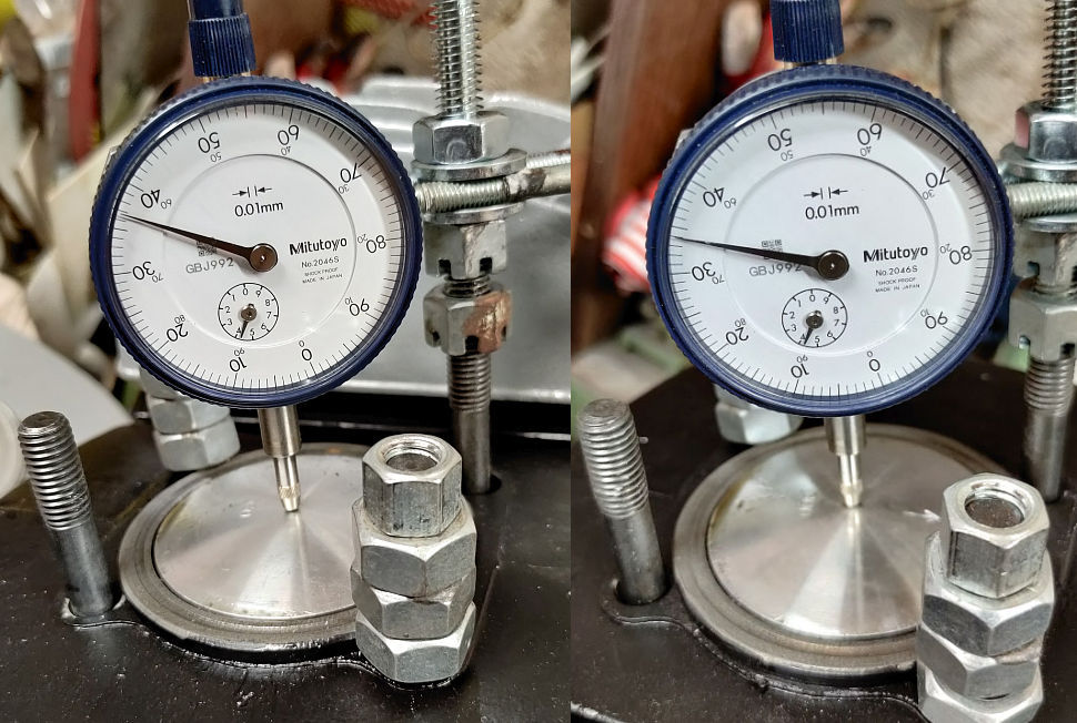 Kuna mikormeeter-indikaator oli olemas, aga statiivi kahjuks mitte, siis tuli veidi improviseerida. Ilus see ehitis ei saanud, aga asja ajas ära. Silindrile siis risti sirge latt peale ja keerasin kolvi tipu sinna vastu, ehk silindri serva tasemele. Seejärel mikromeeter oma nulliga sinna vastu.