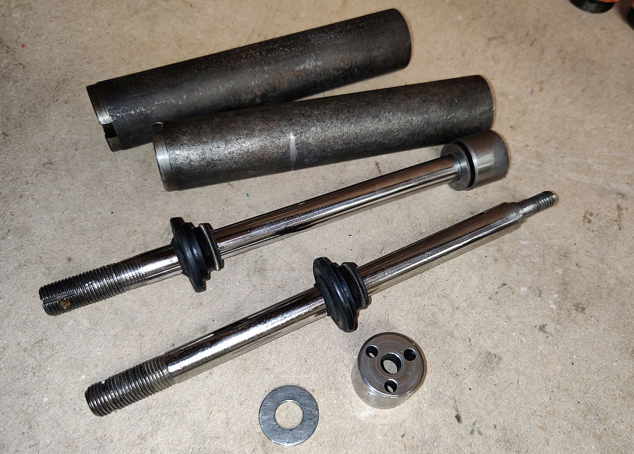 Järgmiseks said ette võetud tagaamordid. Amortide korpused olid küll juba värvitud, aga nendega läks seekord sedapidi, et sisude koostamise otsustasin jätta miskipärast hilisemaks tööks. Kui siis detailid lauale said, selgus, et selliste vedrudega ma neid küll koostada ei soovi. Olid teised liiga roostes. Kuna käsitsi ma neid hõõruda ei soovinud, siis otsustasin nad soolhappes puhtaks marineerida. Teine alternatiiv oleks olnud liivapritsiga nad puhtaks lasta, aga paari vedru pärast seda teed ei olnud otstarbekas ette võtta.