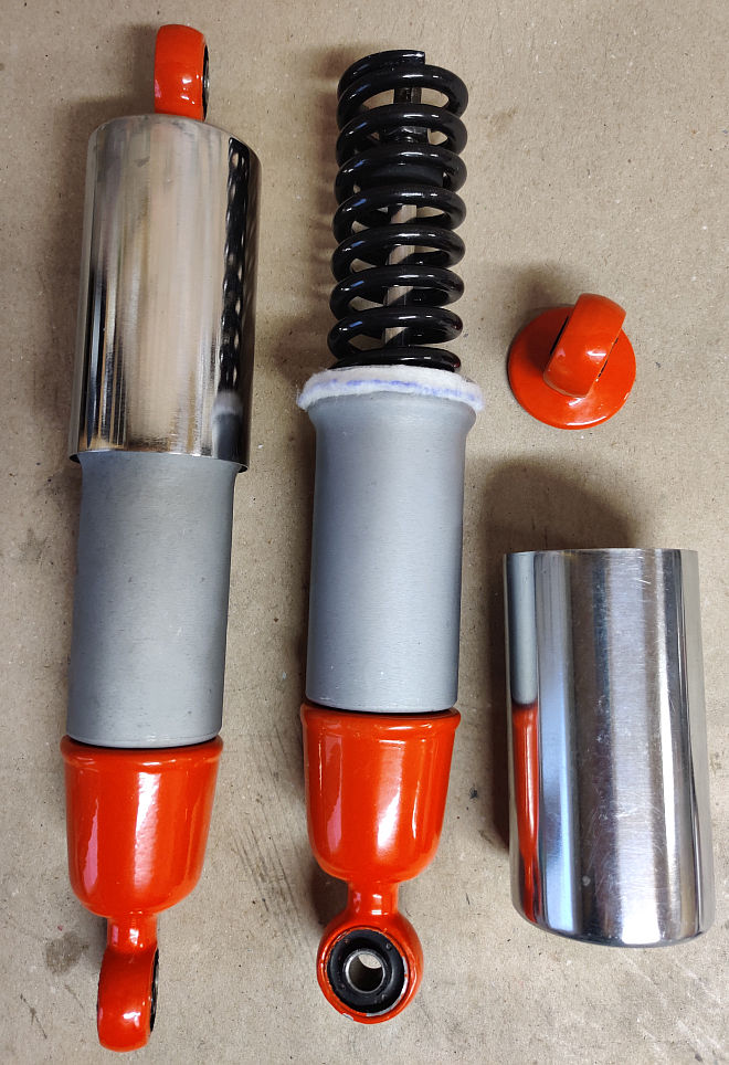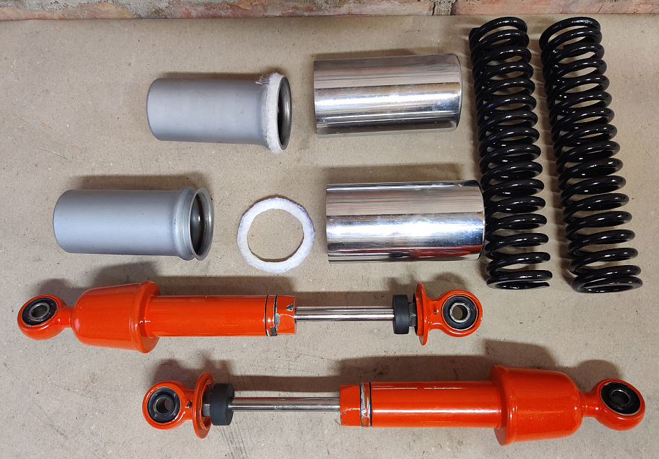 Lõpuks said nad nagu amordid ikka. Kroomitud katted said juba varemalt teemast läbi käinud originaalsed-määrdes palju aastakümneid oodanud uhivanad isendid - ükskord pidid nad ju paika saama Smile . Olen sellist läikiv+matt kroomitud komplekti siiani märganud ainult Jupiter-del, aga remargina olgu öeldud, et just hiljuti varasemaid fotosid läbi vaadates selgus minu jaoks üllatusena, et ka Riia Motomuuseumis oleval IŽ-56-l on täpselt selline komplekt tagaamortidel. Miskipärast arvasin, et selline kooslus oli ainult Jupiter-del kasutusel. Aga no kuna tegu oli ja on nii suure imede maaga, siis ilmselt tuli seal nii mõndagi ette plaanimajanduse nimel.