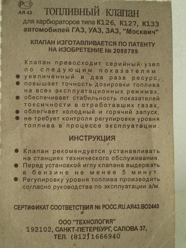 Patendi alusel toodetud? Kummikoonusega ujukinõelu toodeti juba eelmise sajandi keskpaigas, võib-olla veelgi varem. Eriti küsitav on lause "enne montaazi leotada bensiinis vähemalt 5 minutit". Mis, sellega muutub bensiinikindel kumm paremaks, või ei ole ta enne leotamist tehniliselt võimeline bensiinivoogu peatama? Imedemaa...