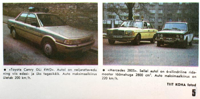 Korrakaitseautode tippmudelitest meie koduvabariigis räägib ajakiri Noorus 6/90 (fail manuses) - ära on toodud piltidel Camry 4WD ja MB 280.