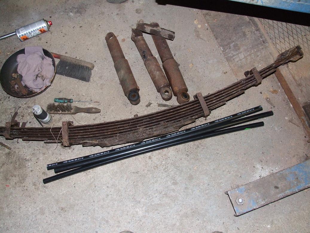 Eks seal nokkimist rohkem. Vaja vahetada amordid, käsipiduri trossid, stabika varda puksid. Rummu maha pusides avastasin ka, et üks vedruleht on katki (paistab rummu pildil). Nüüd vaja otsida kusagilt GAZ53 vedrulehed ja mõlemal pool ära vahetada. Muidu jääb auto äkki kaldu.
