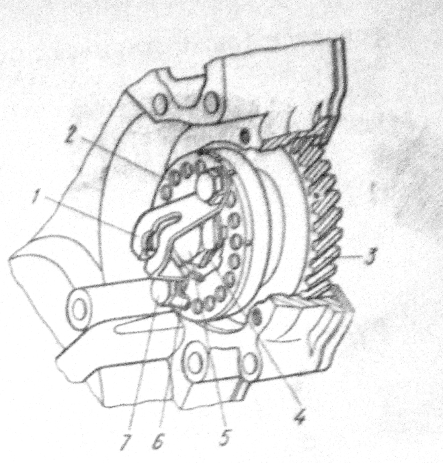 Nüüd pöörad kütusepumba (uuematel masinatel kompressori) võlli poldist 5 kellaosuti liikumise suunas kuni stutsist pumba peal ilmub kütus. Võid kindluse mõttes teha paar katset. Nüüd kinnitad flantsi 2 uuesti hammasratta külge, vaatad, millised avad langevad kokku. Enne poltide 7 lõplikku pingutamist teed veel kontrollkatse, nüüd pöörad võtmega väntvõllist tervelt kaks tiiru. Ära unusta polte pingutamata.
