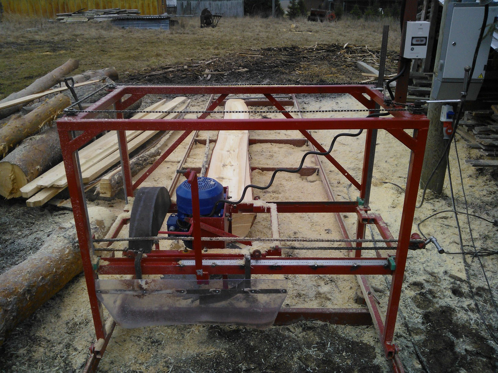 Kudusin ka valmis. Mootor 7,5 kW; 3000 p/min; saeketas 500 mm. Täna sai saetud esimene palk. Üsna ideaalselt sile materjal tuleb. Ketas ka terav veel.