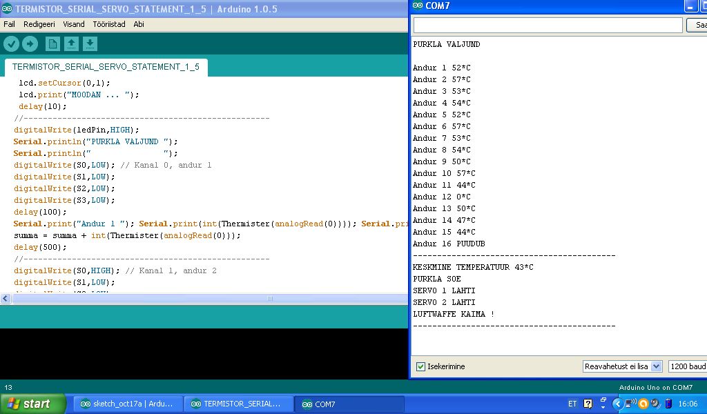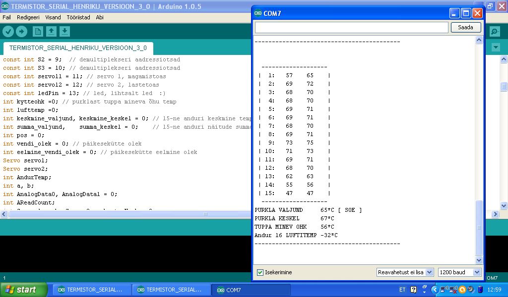 Purkla keskosas on samuti 15tk andurid torude pinnal +1 siseõhu tempi mõõtmas. Nende jaoks aga ei ole mul praegu demultiplekserit, mis lubaks selle pinu andureid ühe mõõteahela külge riputada. Tellisin kollaste mehikeste juurest ära, aga see võtab aega. Kui nende näite ka nägema hakkab, siis saab aimu, mis keskel toimub ehk kui kiiresti õhk toru läbides soojeneb. Nende andmetega saab juhtida ventika kiirust.