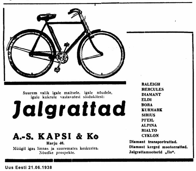 Vasakul üks väheseid leitud reklaame, kus mainitakse jalgrataste omatoodangut („kroomrattad oma tööstusest“), ilmus Päevalehes 1.05.1937 (sama ka Uudislehes 13.05.1937). Paremal reklaam Uus Eestis 21.06.1938.