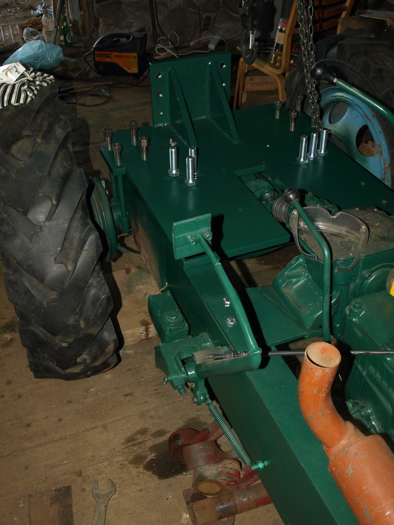 Rippsüsteemi toel on omaarust tugevust piisavalt ja esimene ja peamine rippsüsteemi vidin sai ka külge. Üle mõõtes selgus, et see asi on 1 cm vasakule saanud, aga tühja temaga, sellest ei saa silmaga aru ja vaevalt, et ka ekspuatatsioonis tunda annab. Pingutitega on ka selline jama, et ei lähe keskelt otsa- tagasilla kobakas jääb ette. Mõõtsin, et kui pingutite otstel mõlemalt poolt sent maha võtta ja võll ka lühemaks lõigeta, siis peaks otsa minema- mis hirmsat jõudu seal ikka on, et natuke kitsamad ei tohiks olla..