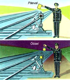 Tähendab- kollane markeeris midagi. Või kas see ikkagi on kollane? Ehk on pleekinud valge? Küsimusi tekib juurde- milleks neid klaase ükshaaval katta? Loogiline oleks, et need olid eri värvi ning tähistasid luba liikuda või vastupidi. Kas roheline ja punane klaas on vahetatud läbipaistavate vastu?
