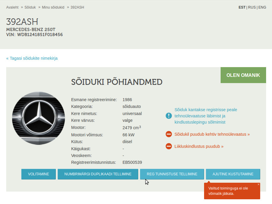 Tühistasin ajutise registrist kustutamise. Sõiduki andmetesse ilmus kirje> Liikluskindlustus puudub. Kui sõidukit ei kasutata, pole liikluskindlustus vajalik kuni 30.09.2015. Kindlustusandjate info leiate LKF-i kodulehelt . Jälle natuke armuaega? Muidugi poliis.ee ei leia sõidukit?!