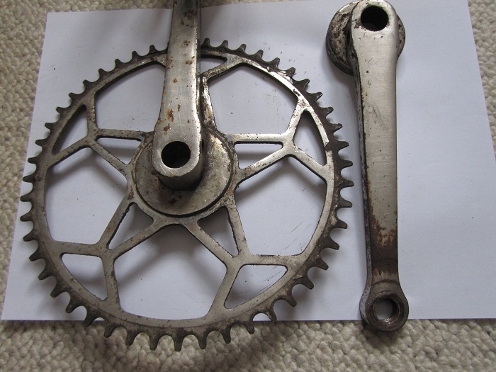 Originaalkeskjooksu ja vändad säilitasin, peaks kellelgi olema vaja Riga 10 taastamisel, võtku ühedust. Ketiratas muide kinnitub vändale vindi ja kontramutriga ja pedaalivõllid on peene keermega. Parema vända pedaalilaba on asendatud mingi enneolematult suurele saapale sobiva labaga- võibolla sõjaväe rattalt?