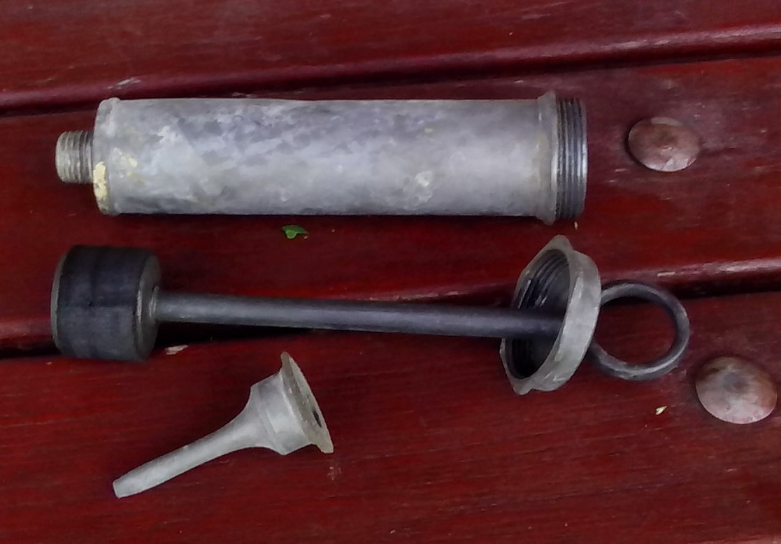 Leitud mingi pumba moodi asjandus. Vana omaniku arvates on tegemist jalgratta pumbaga , kuid selles väites ma kahtlen kõvasti. Välimuse järgi otsustades, võiks olla ka tordi-prits, kuid ei ole. Valmistatud vist valgevasest, üsna raske , ilmselt üle 60-70 aasta vana. Pikkus u 25cm , otsas peenike auk u 1,5mm.     Mis see on?