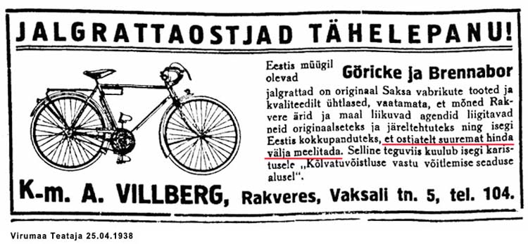 Rakveres oli Brennaboride turustamisel konkurents tihe. Peale Anton Villbergi firma reklaamisid Brennabori veel vähemalt 6 Rakvere äri: Joh. Avik, A. Leetberg, Joh. Veske, V. Viil, Lille & Voolmaa ja Hugo Lille.