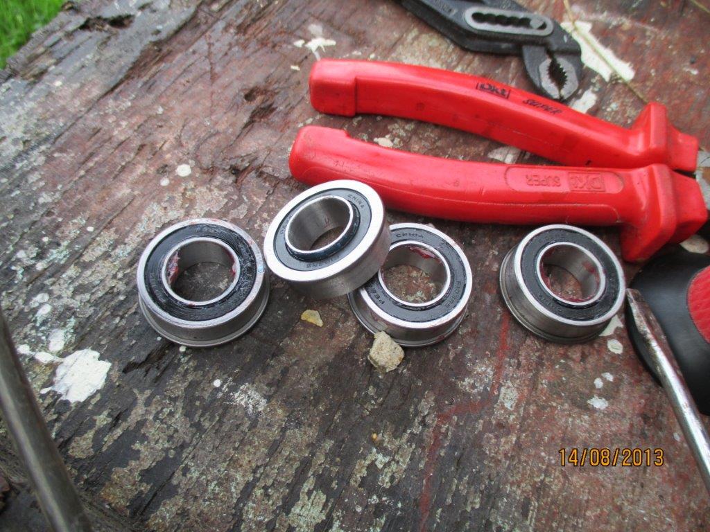 Kahele esimesele ekspluatatsiooniaastale järgnevad ajad lähevad aina lõbusamaks. Ühel hetkel tundusid esirattad kuidagi lääpas olevat, loksusid ka imelikult. Kiirel käel stopperid eest ära ja rattad maha. Kui Husqu raideri on teinud toslem siis see kodanik kes johni veermiku on projekteerinud on väärt Jaan Tatika nimelist kartuli auraha. Mõtlesin, et mulle vaatavad vastu laagrid või noh, hädise variandina plastikpuksid siis see mis rummudest vastu vaatas ajas ka minu paljunäinud silmad ruutu. Esirattad jooksid teraspuksidel, terasest käändteljel. Kui deckis olid kasutusel kinnised laagrid määritavas keskkonnas siis nimetet pukside kaitseks on riistapuul plekist kübar. Muidugi sain ka kohe aru, et peale johni ostu oleks pidanud omale parema käe asemel laskma siirdada määrdepritsi. Õnneks on olemas kümme näppu, mitte nagu t........l ainult pöidlad ja mõnel sõbral veel töötav treipink säilinud. Kiirel käel ftoroplastist neli puksi ja Zlobini meetodil käändteljed lihvitud. Rattad taas õiges asendis.