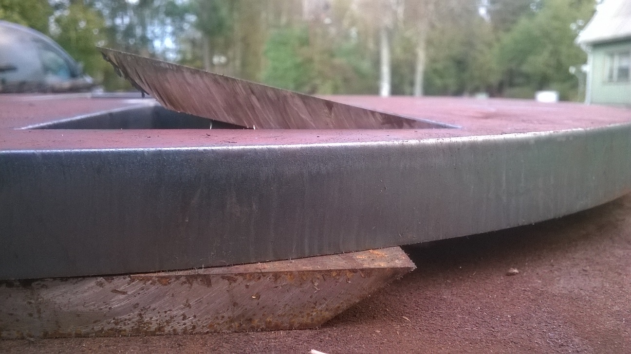 Vabandan väga tülitamise pärast aga siiski veel paar lahtist küsimust, eitaha kohe elektroodi järele haarata ning keevitada, eelnevalt natuke täpsustaks teemat. Ühel pildil näha plaanitav tera nurk ja kaugus kettast. Tera serv on 20 mm kõrgusel kettast, endale tundub, et tiba palju, teoorias peaks sedasi tegema 20 mm paksust haket. Kui lasen tera nurga plaadi suhtes teravama nurga alla siis lõikab puitu rohkem diagonaalselt? Eelnevalt plaanitud terade kinnitus sahtlisse langeb ära kuna sahtli servad muudavad sissesööte ava liiga väikeseks ( 70 mm ). Katsetasin eile antud tera jäi lõikamisest järgi selline 10 x 10 x 85 mm jupp toetasin selle jupi otsad ja äsasin haamriga ikka mitmed head matsud, ei murdunud, seega julgen kasutada otstes poltkinnitust.