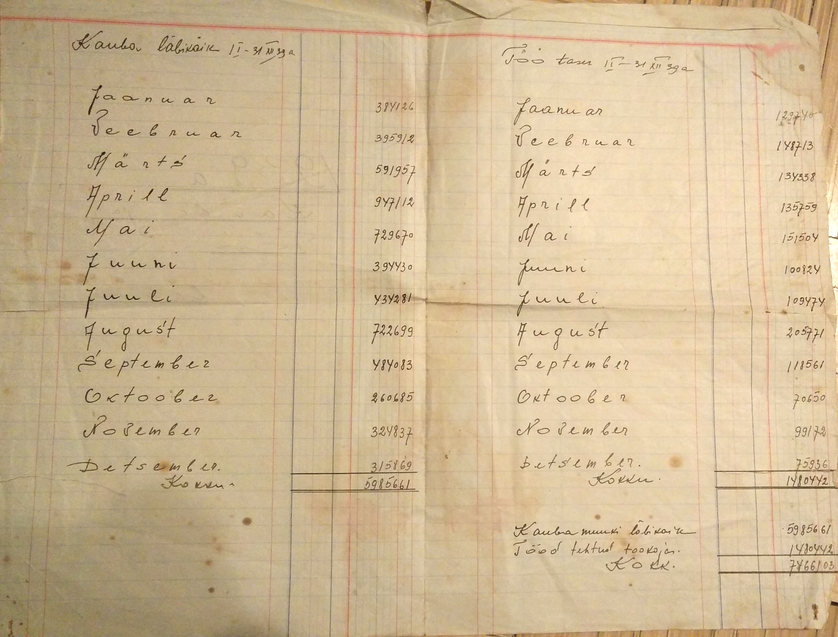 3. Töötajate päevatöö aruannete vihikud 1937, 1938, 1940. Seal on toodud välja mida töötaja mingil päeval tegi, mitu tundi... lisaks ka töötasu arvestus.