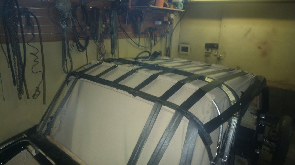 Tänaseks on ka esiosa plekitööd jõudmas lõpusirgele ning katusesõrestik on samuti valmis riide peale tõmbamiseks. Kui küljepinguteid mitte arvestada, siis on katusesõrestiku kogu puit ja metallosa täielikult uus. Osaliselt oli näidiseks vanema mudeli katusesõrestik ning teiselt samasuguselt autolt võetud mõõdud.