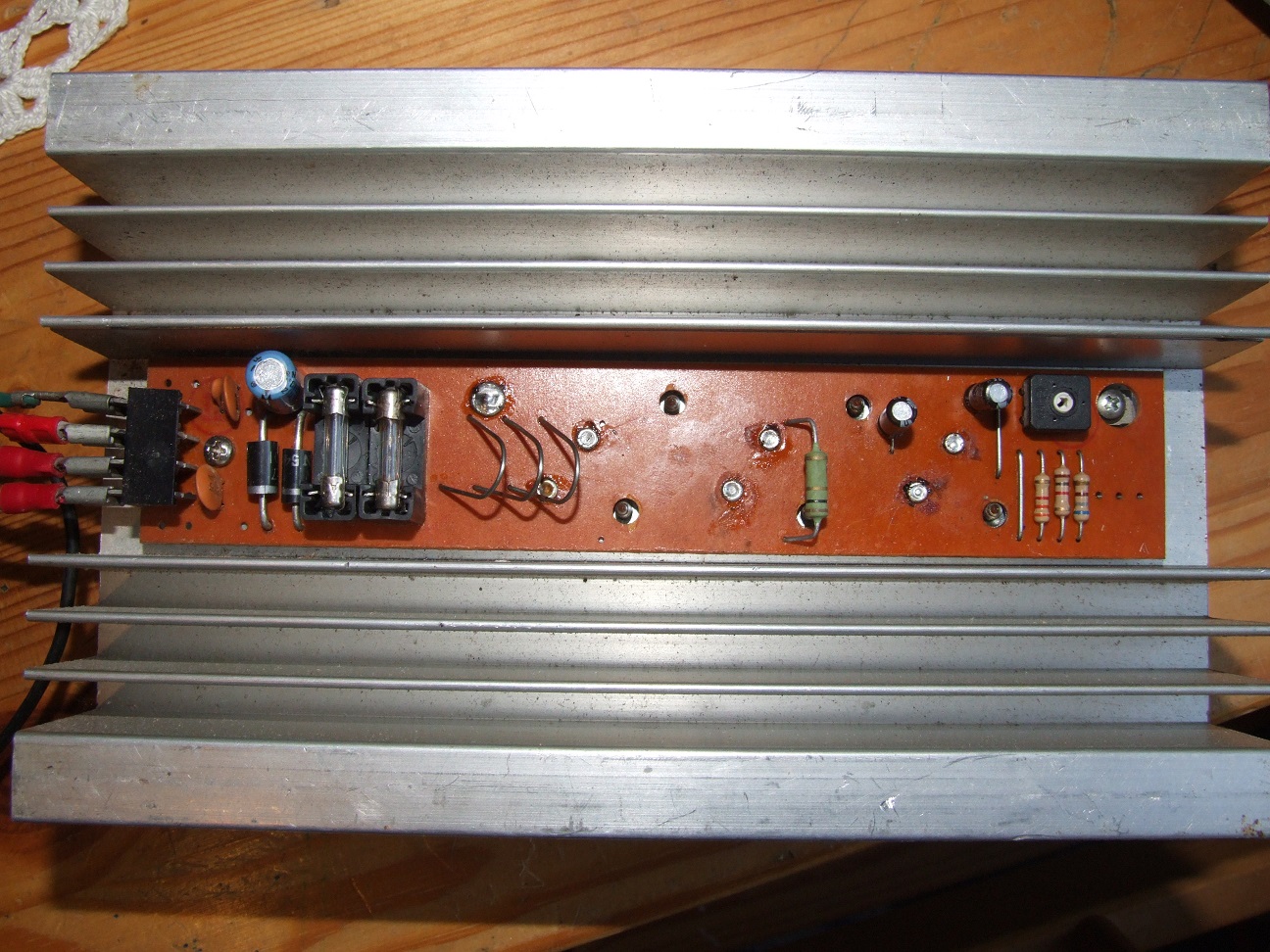 Transistorid on paralleelselt, kaitsmetest paremal pool on kolm takistustraadist 0,2 - 0,5 oomi takistit, mis on ühendatud transistoride emmitterahelatesse, et neid oleks võimalik paralleelselt kasutada. Plaadi paremas servas on plaadi ja radiaatori vahel pingeregulaator, tõenäoliselt LM317 - üleval on näha kinnituskruvi ja all, takistite kõrval kolm auku jalgade jaoks.