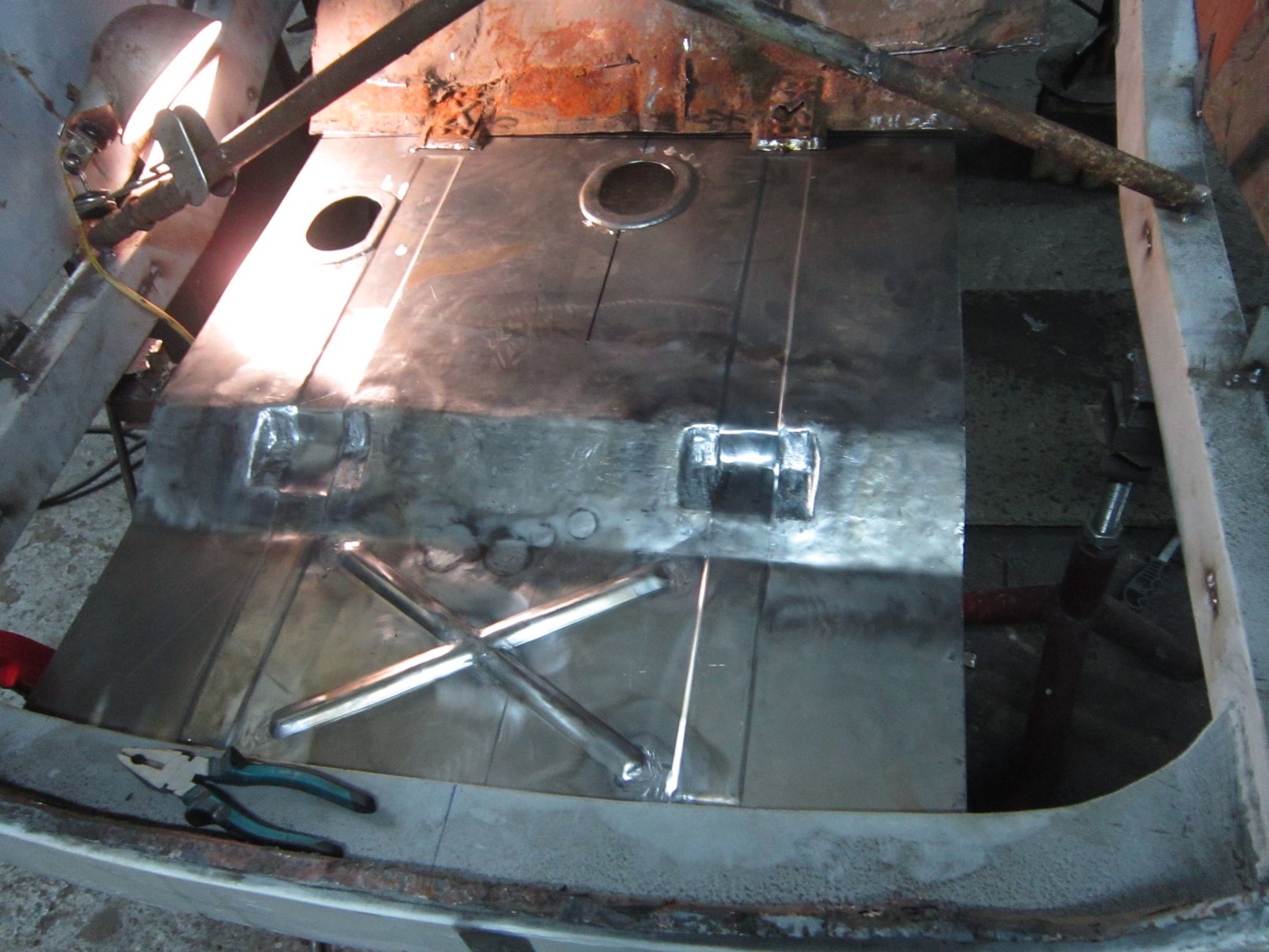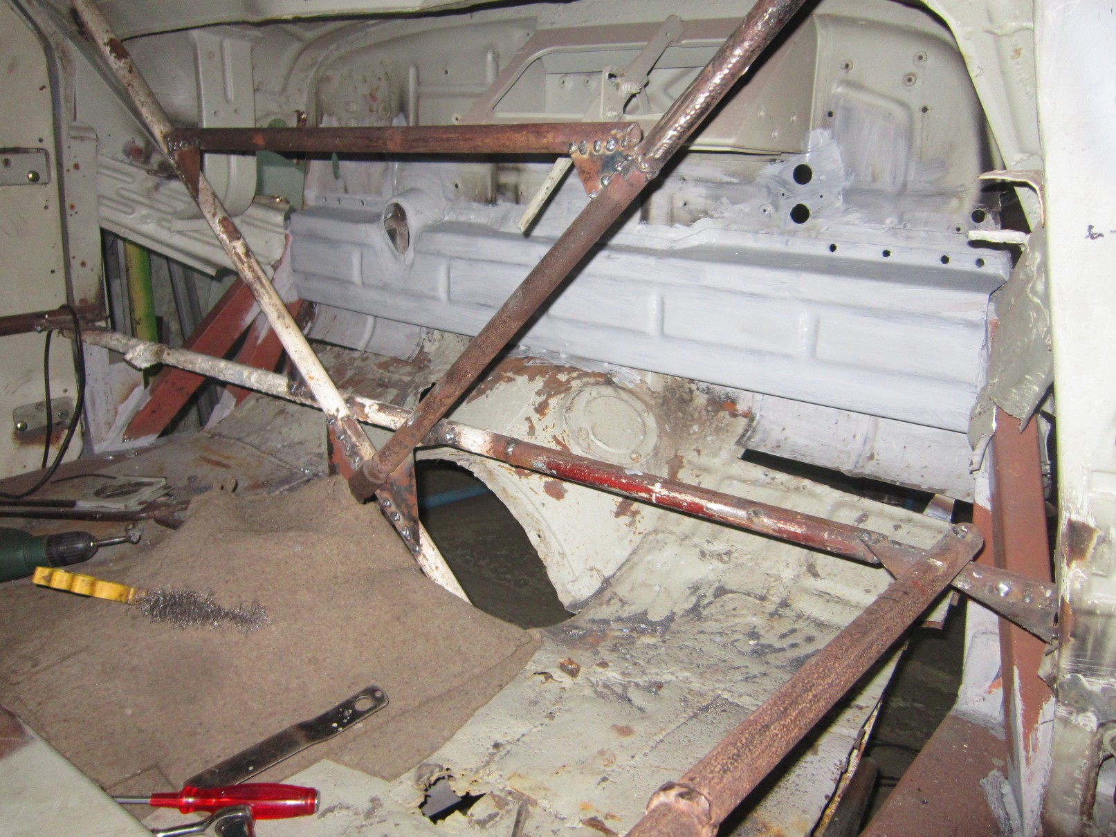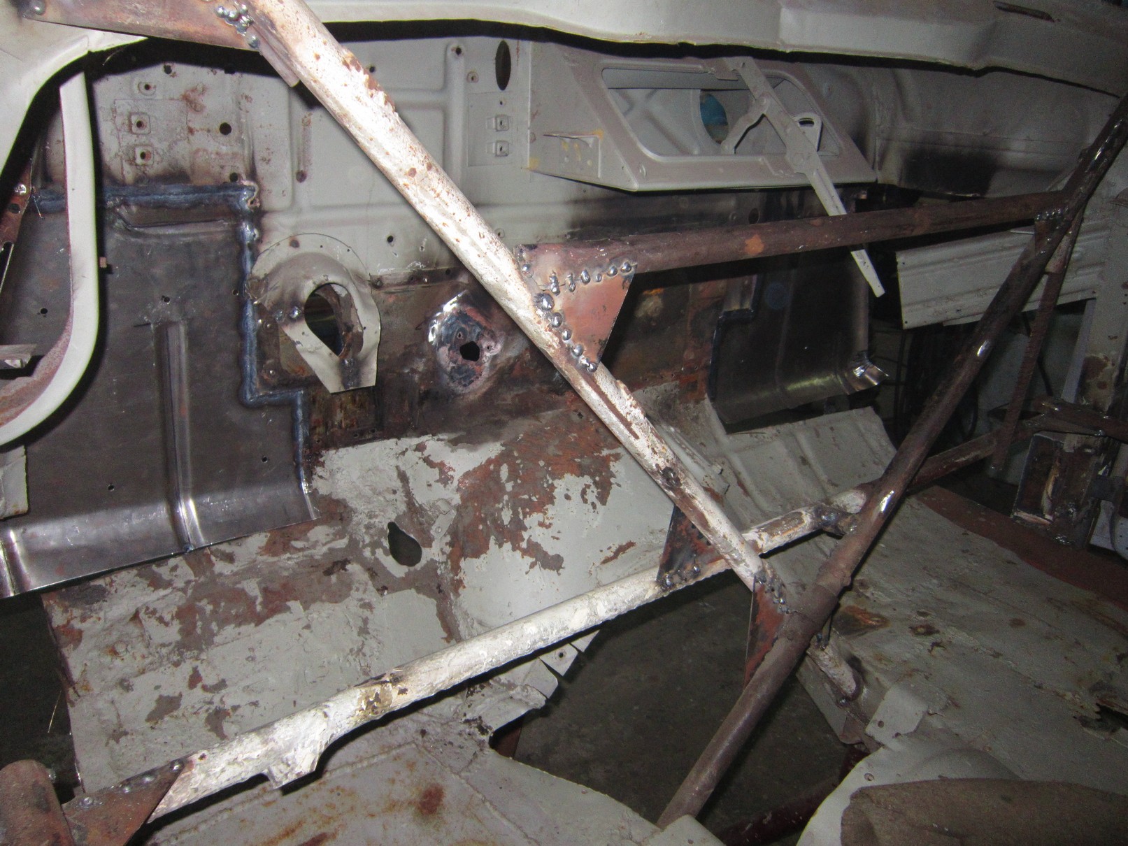 See pagasniku põhi tundub mulle väga imelik, kas oligi selline või on meistrid sinna midagi ajutist leiutanud, et mõõte fikseerida. Tagumine tala kah uus tehtud. Ei tea kas kogu masin läheb uuendusse. Kui esimesi pilte vaadata, siis autost suurt midagi järgi jääda ei tohiks.