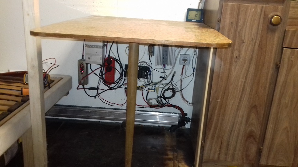 Praeguseks lõpetasingi juhtmete vedamise ära. Kui midagi vaja, küll siis panen juurde. Erinevatel tarbijatel on eraldi kaitsed. Kombineerisin selleks ühe kaitsmeploki. Seal on veel vabu kohti. Vasakpoolsed on 12v ja 24v targad laadijad. Parempoolne siis muundur. Kogu see asi kaob laua taha ära.