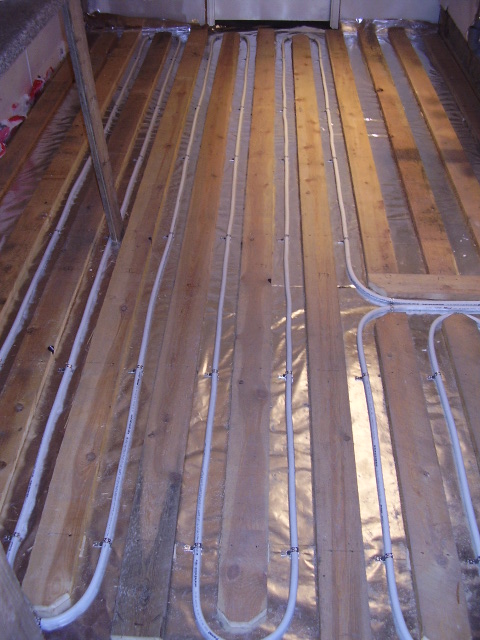Kõige all on vineer, mis annab ühtlase toestuse fooliumpaberile. Vahele ma mingit täidist ei pannud, kasutegurit ma ei suutnud selles näha. Peal on 18 mm. saepuruplaat ja siis parkett. Pealejooksud jäid toa keskele ja liikusin järjest seina äärde. Mahupaak 1,5 kanti ja Viadruse tahkeküttekatel. 50-60 kraadi keskmine ja põrand täiesti meeldiv.