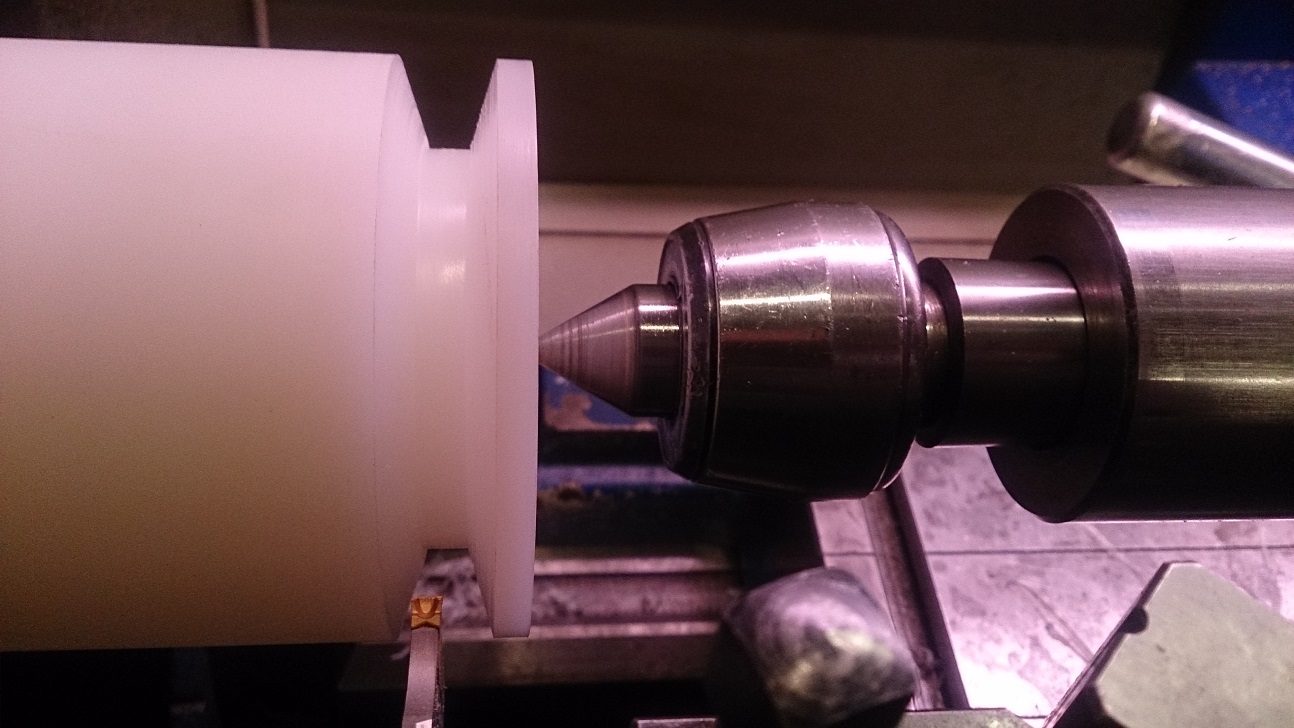 Tahtsin veenduda, et lukustus-rönga soone kauguse joonisele öieti olin arvutanud, tahtsin röngast niiii lähedale laagrile kui vöimalik. Plastik aga ei pruugi päris sajandikutäpsusega välja tulla. Sellepärast panin laagri rulli toorikusse (alles treipingis ) juba treipingis sisse, siis tegin lukustus-rönga soone täpselt laagri kürvale (terega vastu välisvöru ja siis paar sajandikku tagasi, ning löige plastikusse.