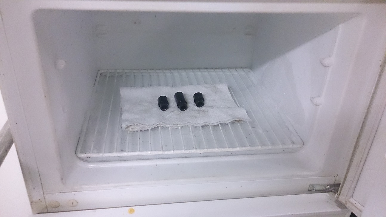 Et pukse lihtsam laagrisse panna oleks (liugistu päris niisama ikka sisse ei lükka, tuhandikutäpsune see pole), jahutasin nad sügavkülmas maha. Laagrit ma ju enam soojendada ei saa, sest panin nad pingis juba plastikrullikusse.